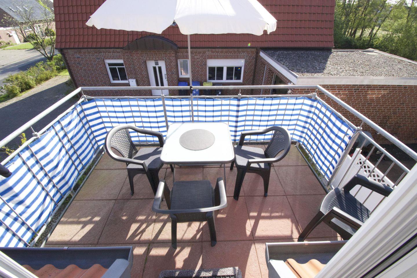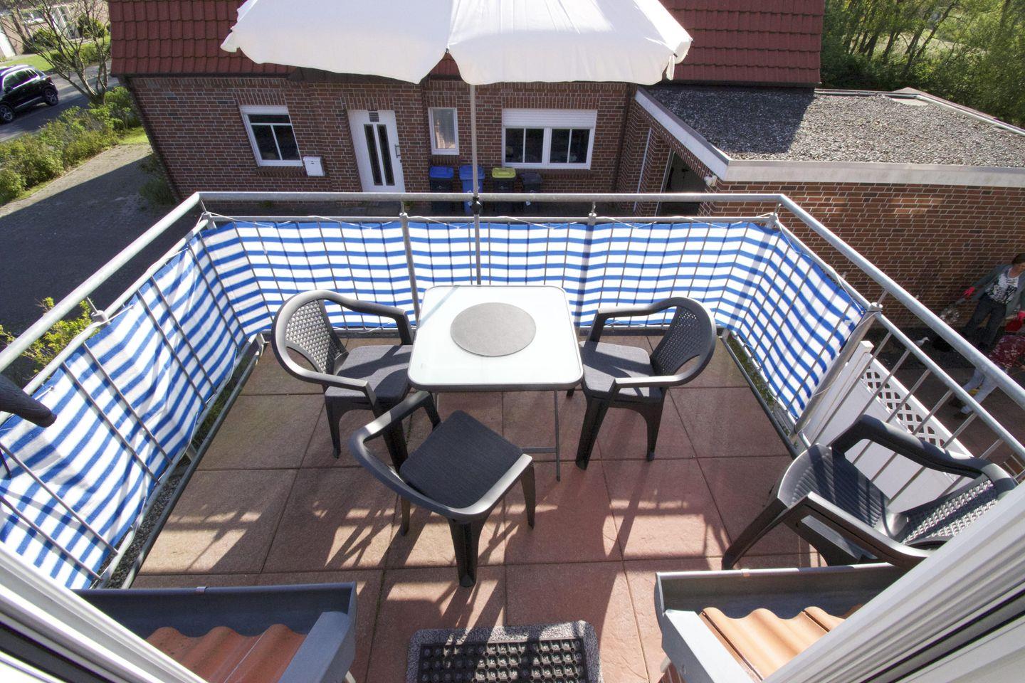 Der Balkon ist mit bequemen Balkonmöbeln ausgestattet und bietet zudem einen Sonnenschirm für angenehmen Schatten.