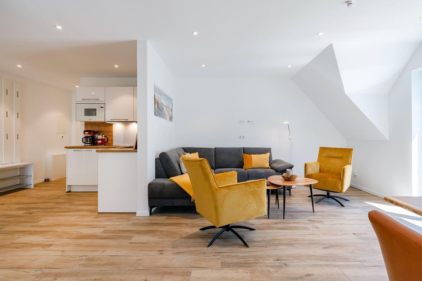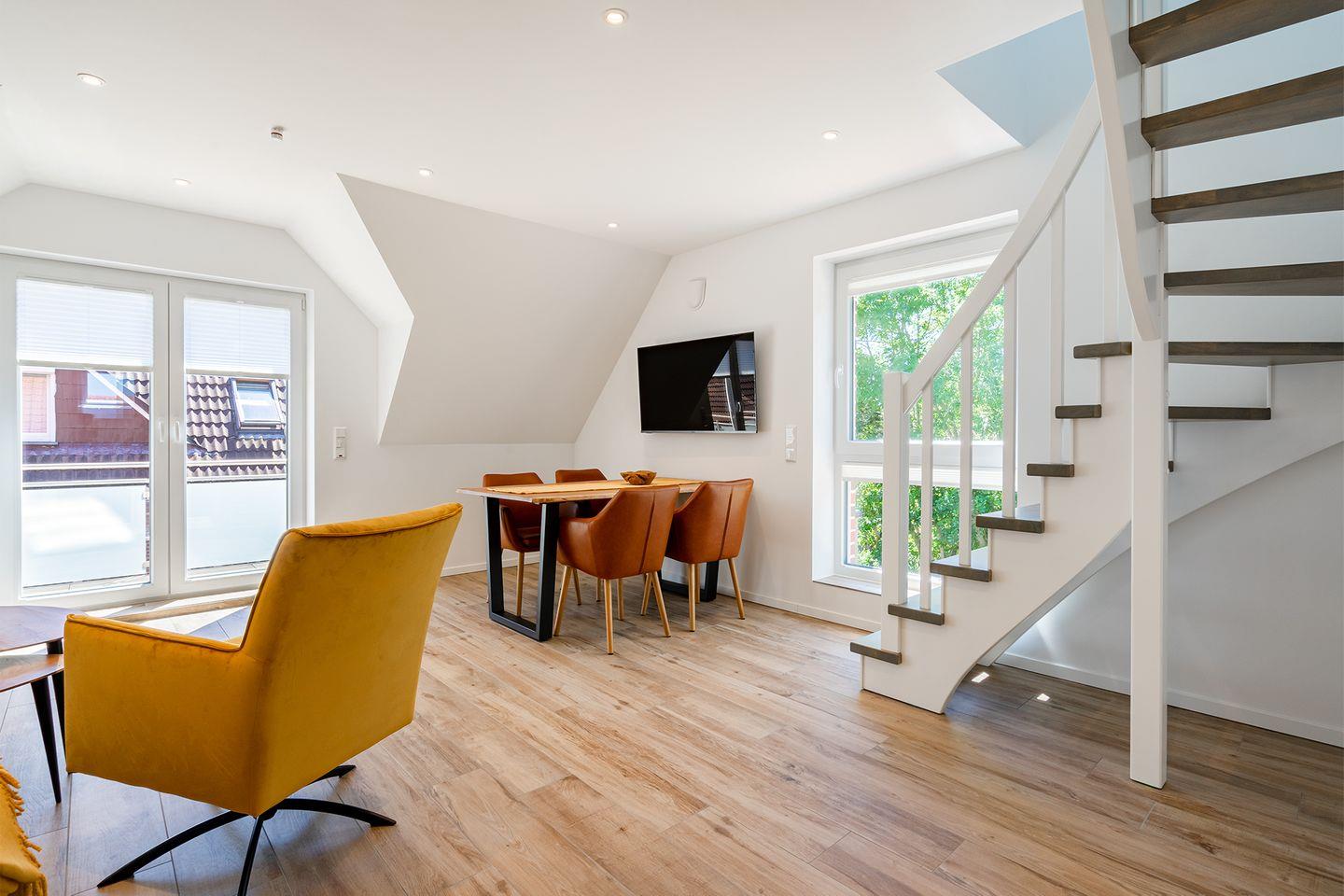 Diese hochwertig ausgestattete Maisonette-Ferienwohnung mit 57 m² Wohnfläche befindet sich in einem neu erbauten Haus, nur wenige Schritte vom Deich und der Strandpromenade entfernt – perfekt für einen entspannten Urlaub an der Nordsee. Die Wohnung bietet Platz für bis zu 4 Personen und ein Kleinkind (unter 2 Jahren) und ist somit ideal für Paare, Familien oder kleine Gruppen. Die durchdachte Raumaufteilung, die stilvolle Einrichtung und die hochwertige Ausstattung sorgen für Komfort auf zwei Etagen.