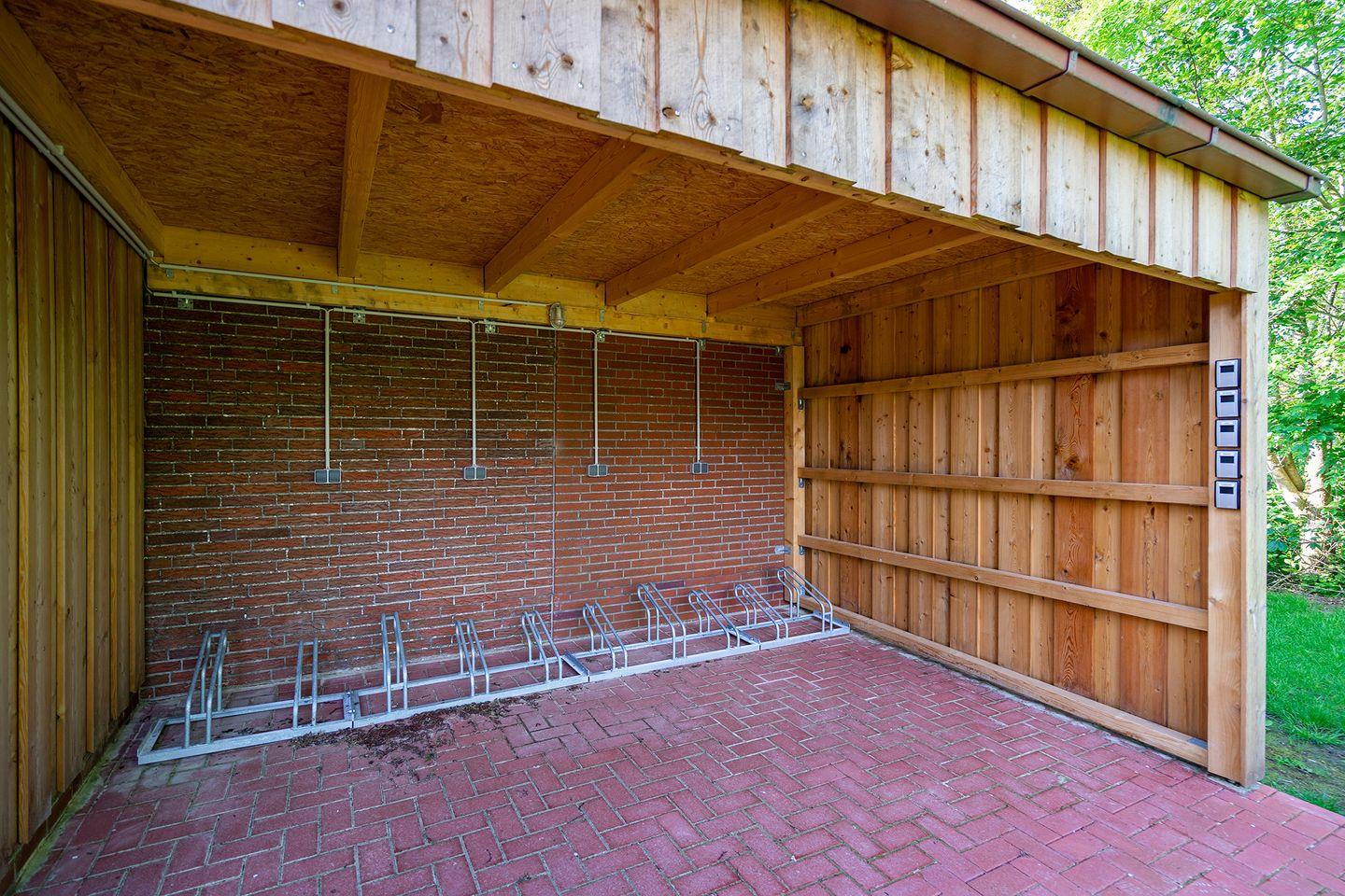Überdachter Fahrradparkplatz mit E-Bike-Steckdosen hinter dem Haus