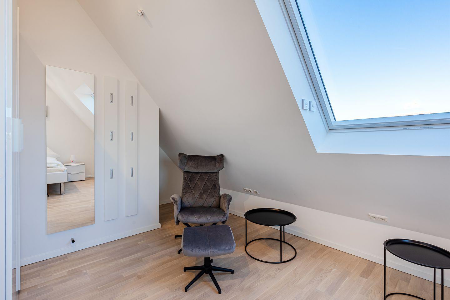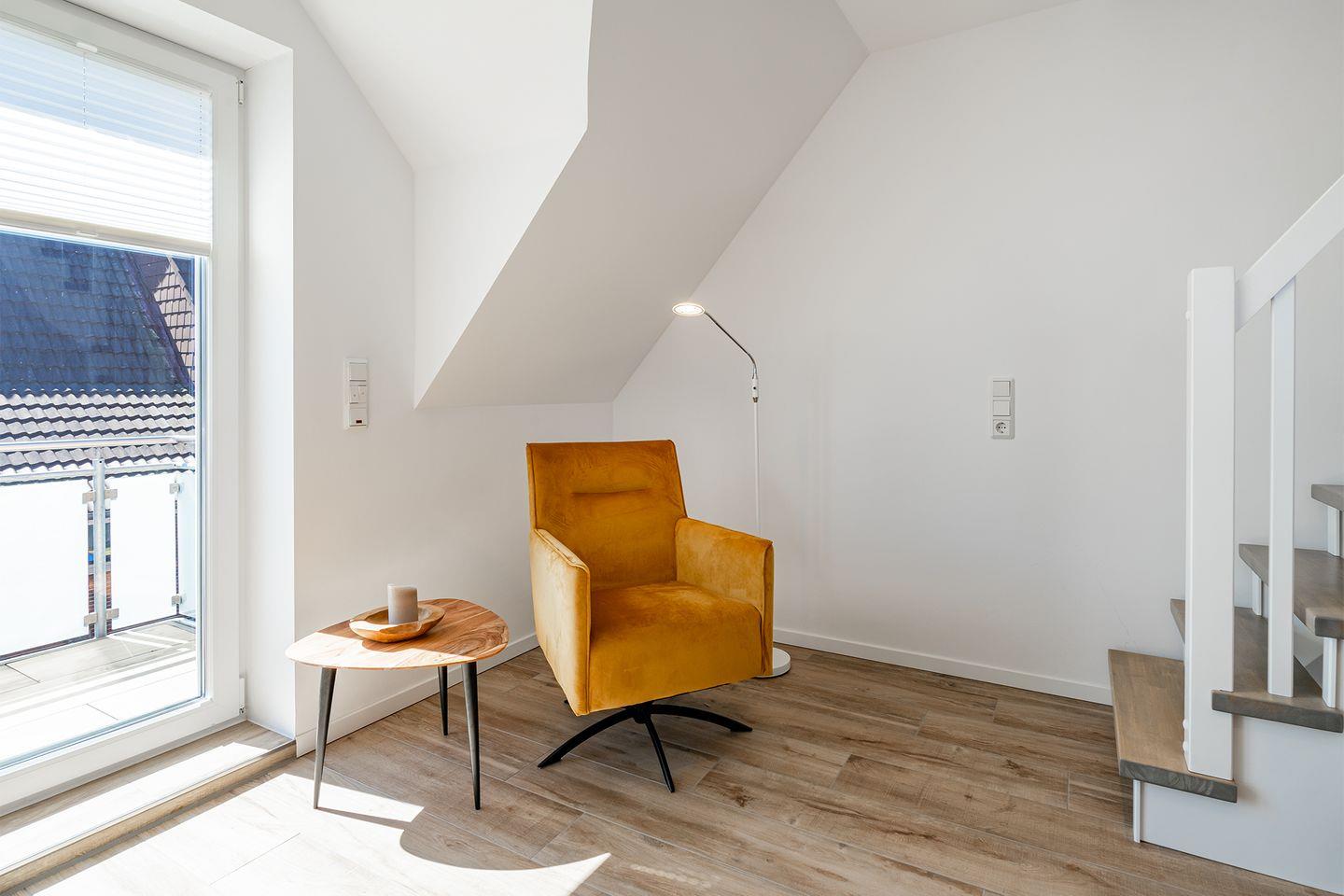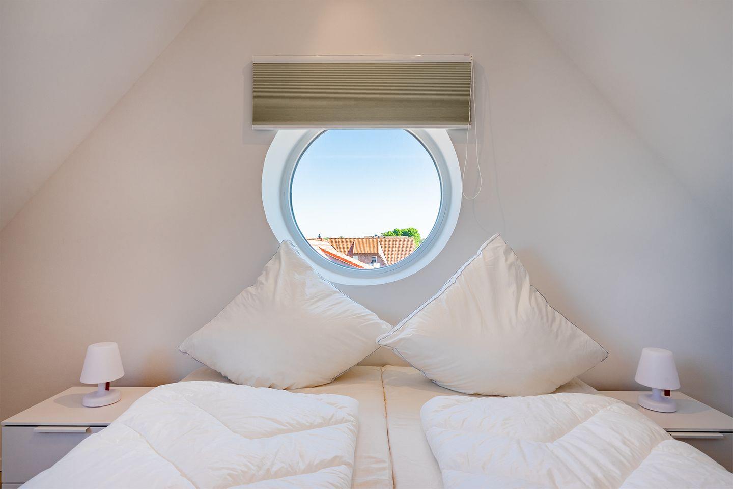 Das Bullaugen-Fenster an der Treppe sorgt für maritimen Charme und bietet einen Blick auf unverbaute Landschaft. Alle Dachfenster in der Wohnung sind elektrisch zu öffnen und mit elektrischem Außenrollladen (Verdunkelung).