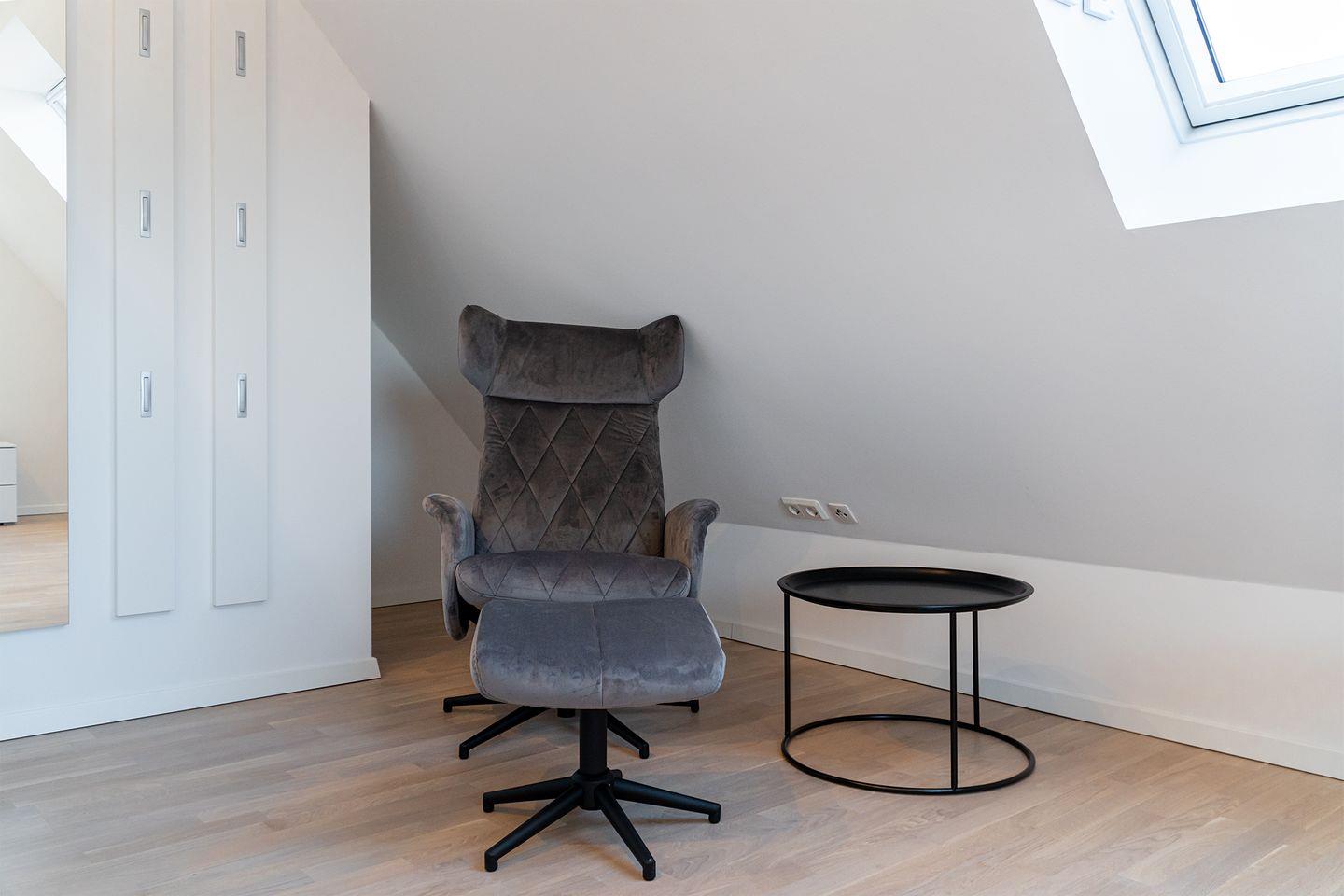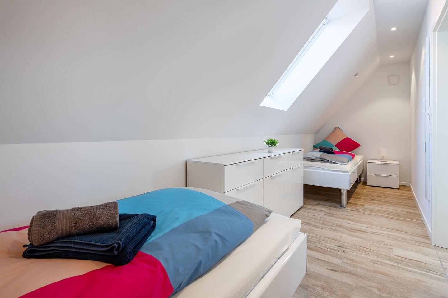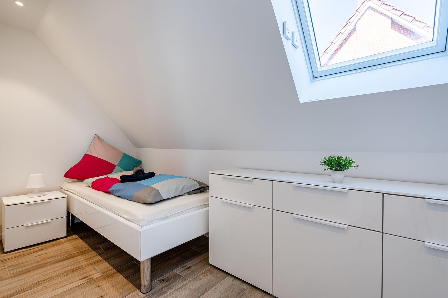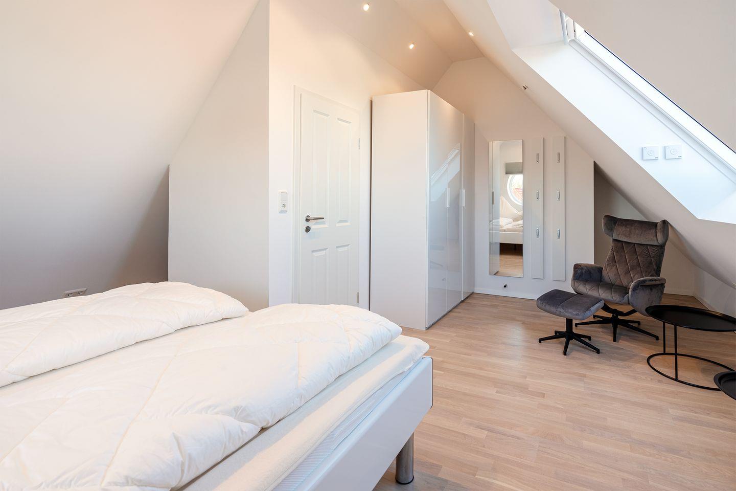 Das Bullaugen-Fenster an der Treppe sorgt für maritimen Charme und bietet einen Blick auf unverbaute Landschaft. Alle Dachfenster in der Wohnung sind elektrisch zu öffnen und mit elektrischem Außenrollladen (Verdunkelung).