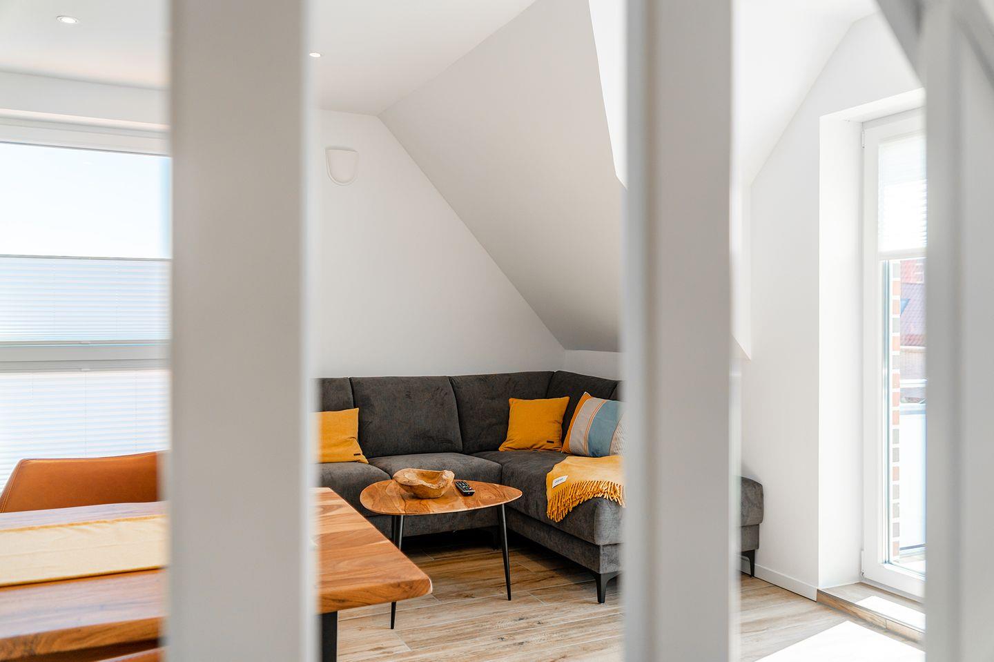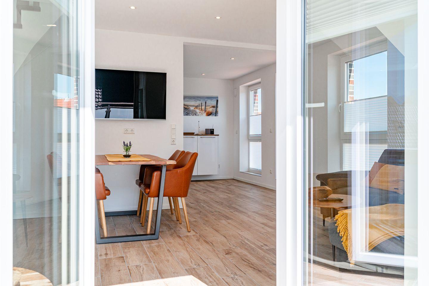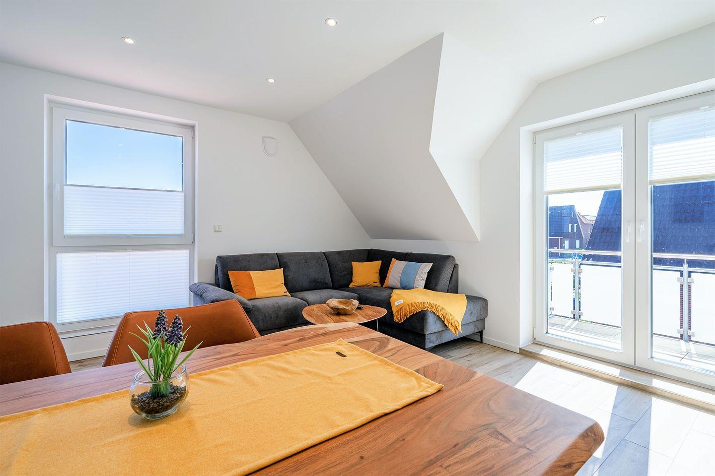 Die Maisonette-Ferienwohnung mit 57qm befindet sich in einem neu erbauten Haus unweit des Strandes. Nur wenige Meter müssen zurückgelegt werden bis zum Deich und der Strandpromenade. Hier finden bis zu vier Personen und ein Kleinkind (unter 2 Jahre) Platz. Der großzügige Wohn- und Essbereich ist strahlend hell und mit allen Annehmlichkeiten wie Couchgarnitur, Esstisch mit vier Stühlen, großes Smart-TV und WLAN ausgestattet. Die Küchenzeile verfügt über eine Spülmaschine und eine Mikrowelle mit Backfunktion.
