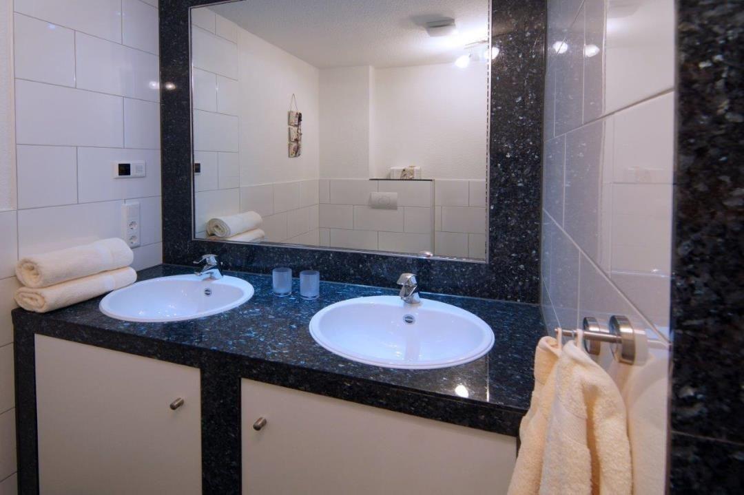 Das einladende Badezimmer bietet Ihnen mit der Fußbodenheizung eine besonders angenehme Heizungsform. Grade in den kälteren Monaten des Jahres ist die angenehme Wärme im Bad eine echte Wohltat. Ein Doppelwaschtisch, ein großer Spiegel und der bereitstehende Fön werden durch die Dusche und das WC ergänzt.