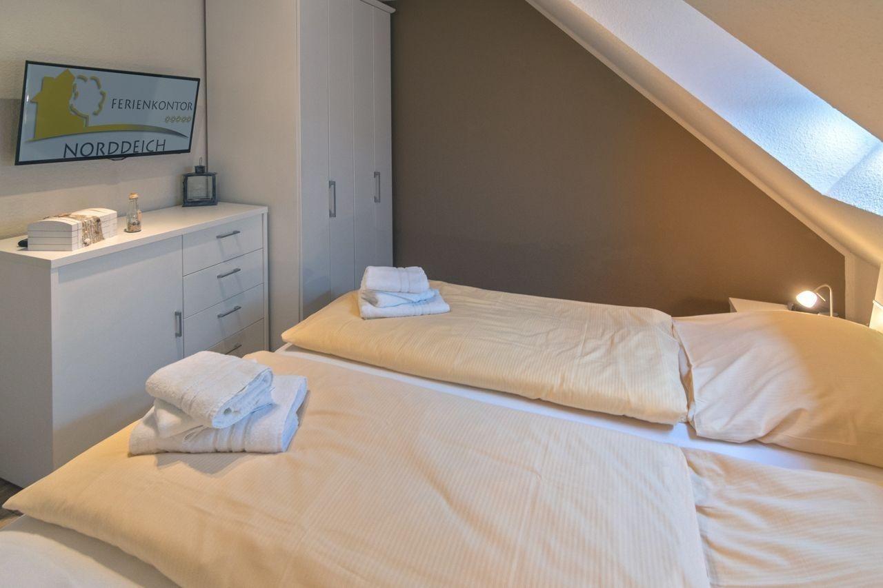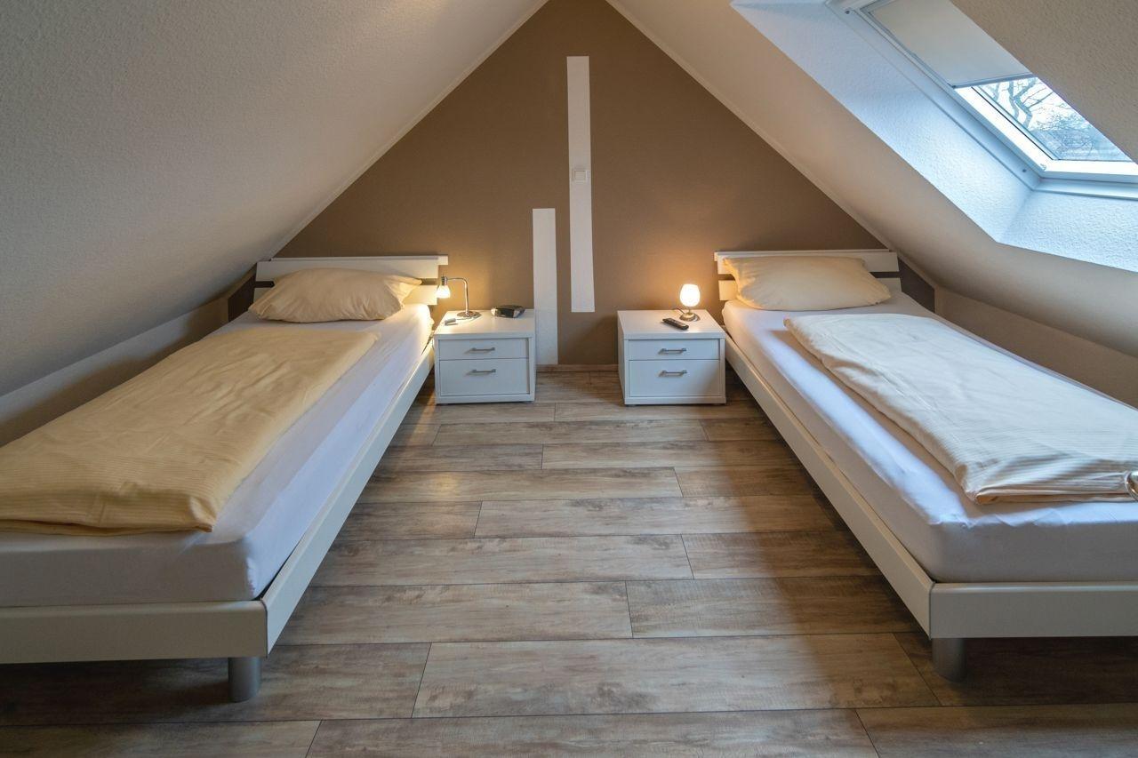 Der zweite Schlafraum der Wohnung befindet sich im Dachgeschoss. Hier erwarten Sie zwei Einzelbetten, welche bei Bedarf zu einem Doppelbett zusammengestellt werden können. Auch hier fehlen Nachttische und ein Kleiderschrank nicht. Ein weiterer Flachbild-Fernseher sorgt auch im zweiten Schlafraum für zusätzlichen Luxus.