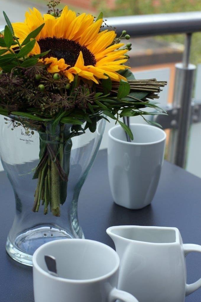 Zur Ferienwohnung gehört ein schöner, sonniger Balkon, welcher sich vom offenen Wohnraum aus begehen lässt.