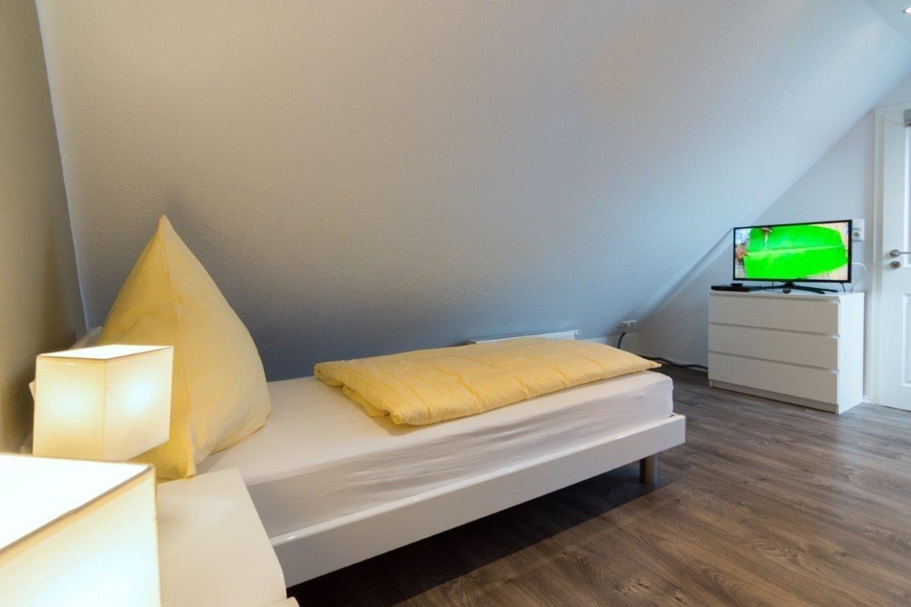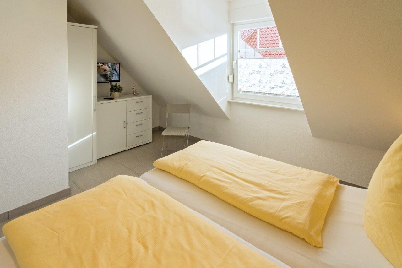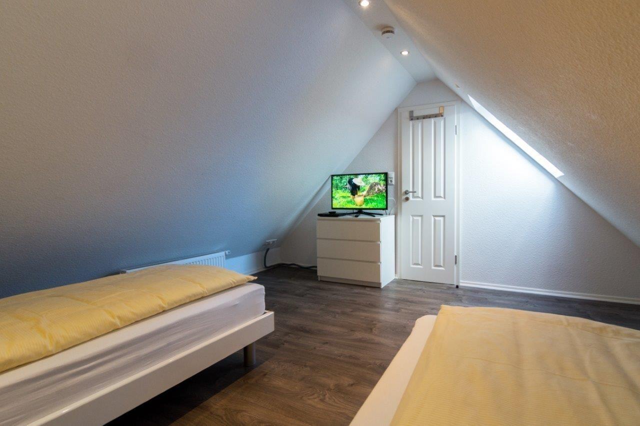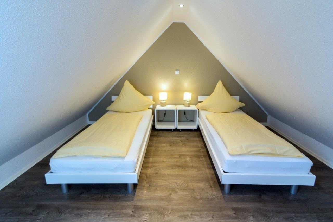 Im Dachgeschoss erwartet Sie ein weiterer Schlafraum. Dieser wurde mit zwei Einzelbetten (je 90x200cm) ausgestattet.