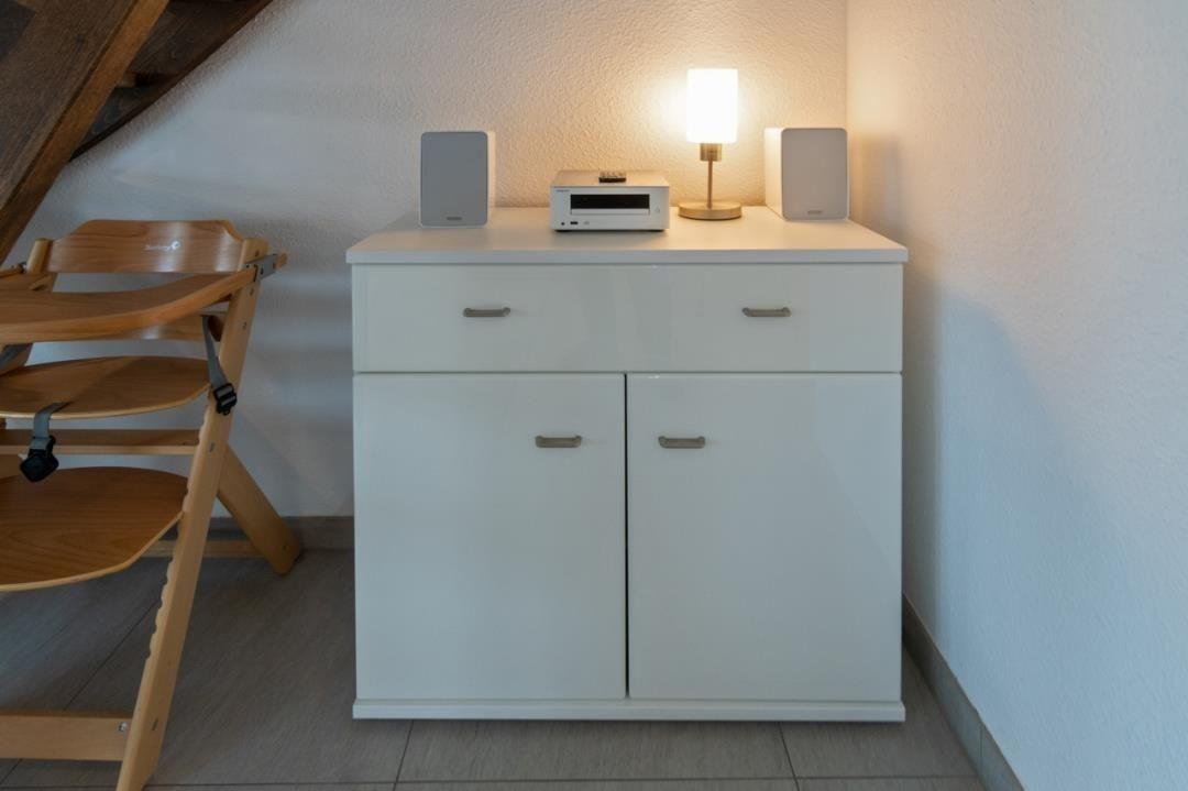 Der einladende Wohnraum ist offen gestaltet. Gemütliche, moderne Polstermöbel finden hier ebenso Platz wie ein neuer Fernseher mit SAT-TV und DVD-Player (inkl. DVD). Weitere mediale Unterhaltungsmöglichkeiten bietet Ihnen der CD-Player mit Radio.
