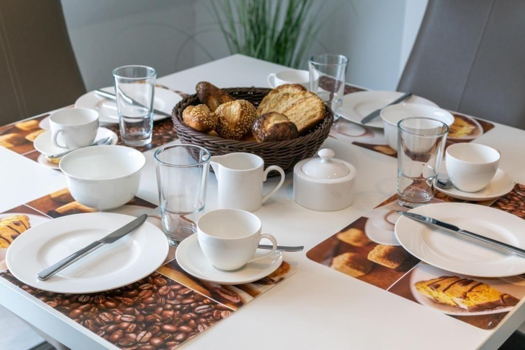 Der Wohnbereich geht offen in die Küche der Wohnung über. Auch im Küchenbereich wurden Sitzmöglichkeiten geschaffen. Hier lassen sich gemeinsame Mahlzeiten und gesellige Runden gleichermaßen genießen. Spiele stehen hierzu zur Verfügung.