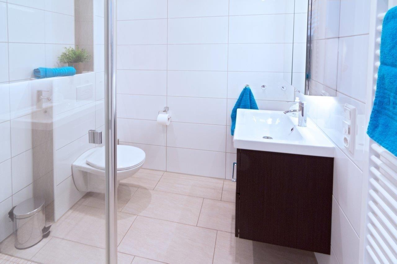 Das Badezimmer wird durch eine Fußbodenheizung auf Temperatur gebracht. Glasdusche, Hänge-WC und handtuchtrockner unterstreichen die komfortable Ausstattung des Bades. Die Waschkombination bietet Ihnen reichlich Stauraum. Ein Haartrockner liegt bereits für Sie bereit.