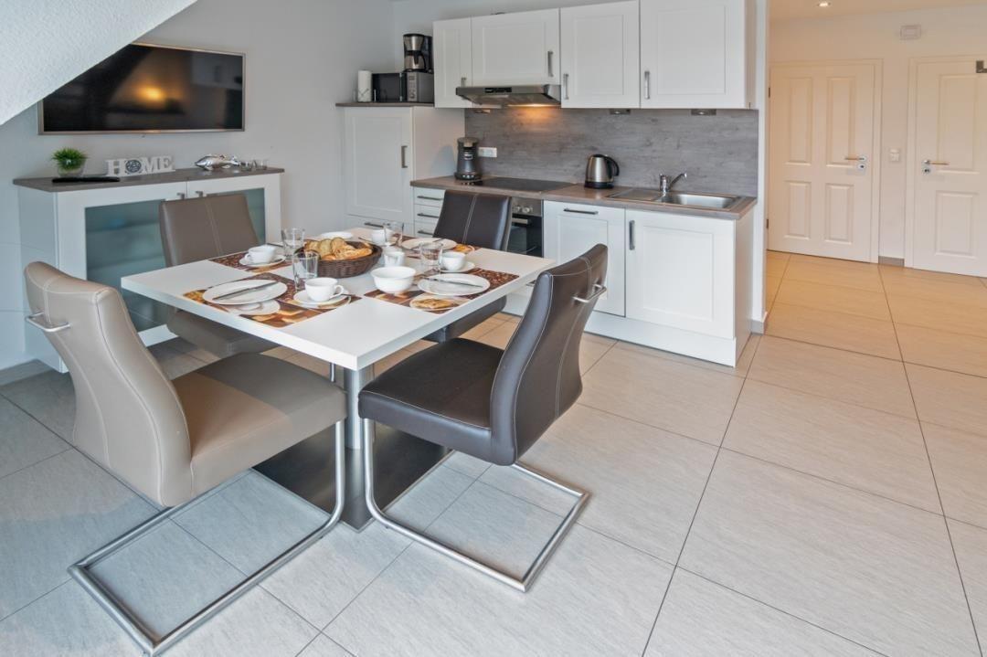 Zusätzlich zum Wohnbereich findet auch die Einbauküche sowie der attraktive Essplatz Platz im großzügig geschnittenen Hauptraum der Unterkunft.