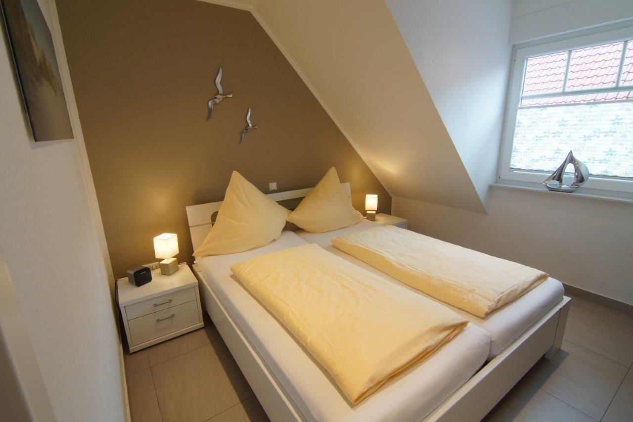 Neben dem Wohnraum befindet sich auch das erste Schlafzimmer im ersten Obergeschoss des Hauses. Hier lädt ein großes Doppelbett (180x200cm) zum Träumen ein. Eine passende Möblierung auf Nachttischen und - lampen und ein Radiowecker ergänzen das Bett stimmig.