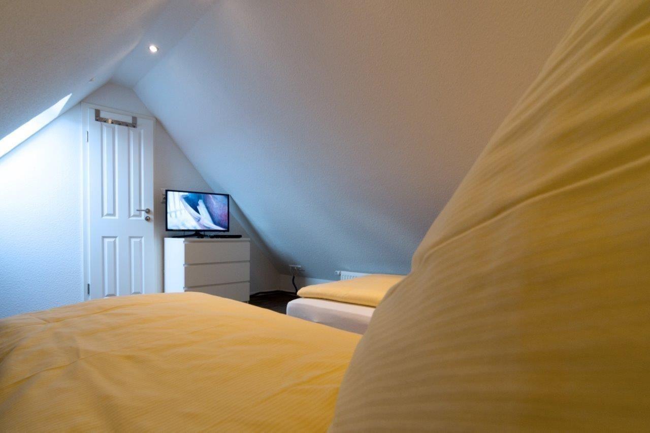 Wie im ersten Schlafzimmer steht Ihnen auch im Dachgeschoss ein eigener Fernseher zur Verfügung.