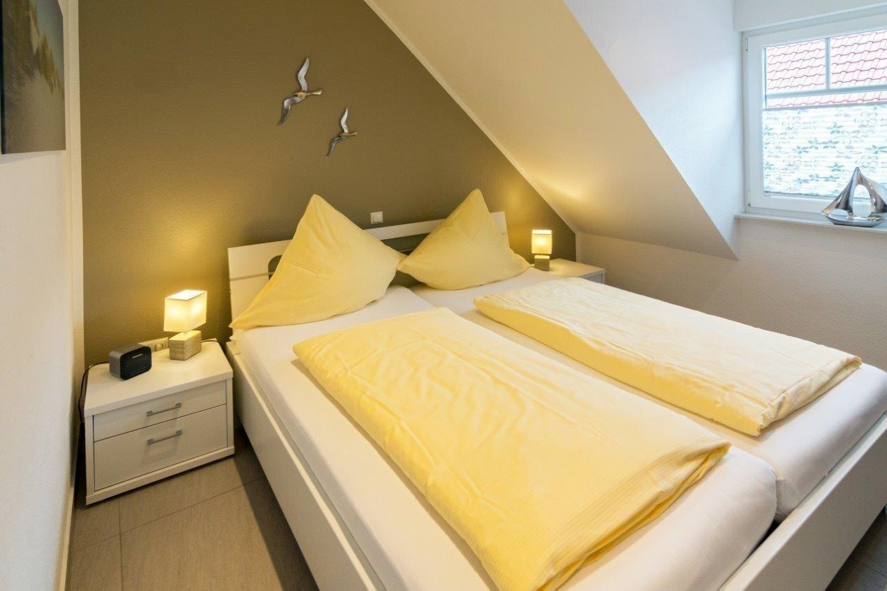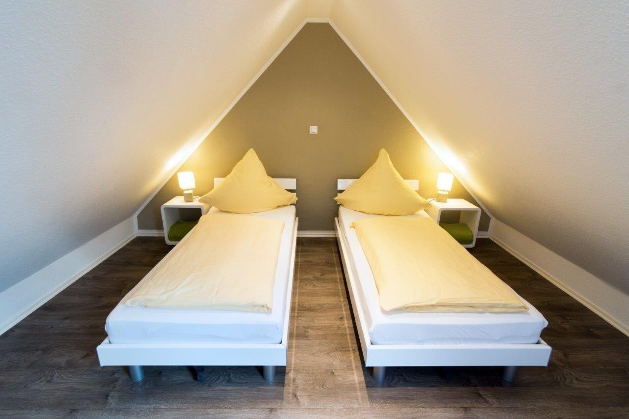 Das zweite Schlafzimmer liegt im Dachgeschoss und wurde mit zwei Einzelbetten (jeweils 90x200cm) ausgestattet. Auch hier werden die Betten durch passende Nachttische mit Beleuchtung ergänzt. Ihr Gepäck findet in der vorhandenen Kommode Platz.