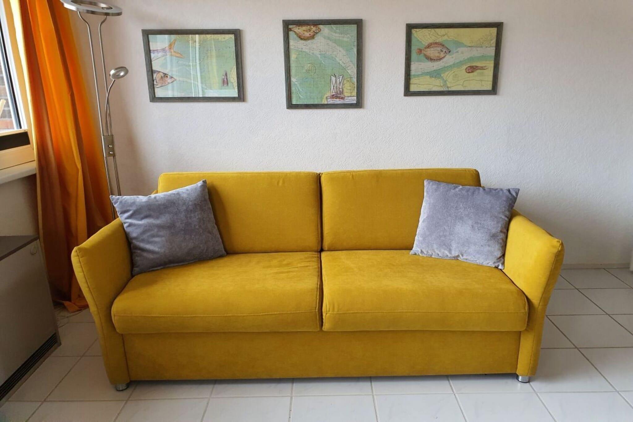 Ihre Ferienwohnung ist ein stilvoll eingerichtetes Einraumapparetment mit allem, was das Herz begehrt. Neben dem Badezimmer mit Dusche, finden Sie in dem großzügig geschnittenen Appartement eine moderne Küchenzeile mit Ceranfeld, Mikrowelle, Wasserkocher, Kaffemaschine und ausreichend Geschirr für kleine und größere Mahlzeiten vor. Die nagelneue Couch ist mit einem Handgriff zu einem vollwertigen Bett umzufunktionieren. Dadurch ist der für einen erholsamen Urlaub notwendige Schlafkomfort in dem dann 1,60m mal 2,00m großen Bett mit Lattenrost und Matratze bestens gegeben. Nach dem Aufstehen kann die Bettwäsche bequem in der zum Sofa gehörenden Truhe verstaut werden. Ein Esstisch mit vier Stühlen, der Flatscreen und natürlich ein Balkon mit Sicht auf den Deich runden die Wohnung ab.