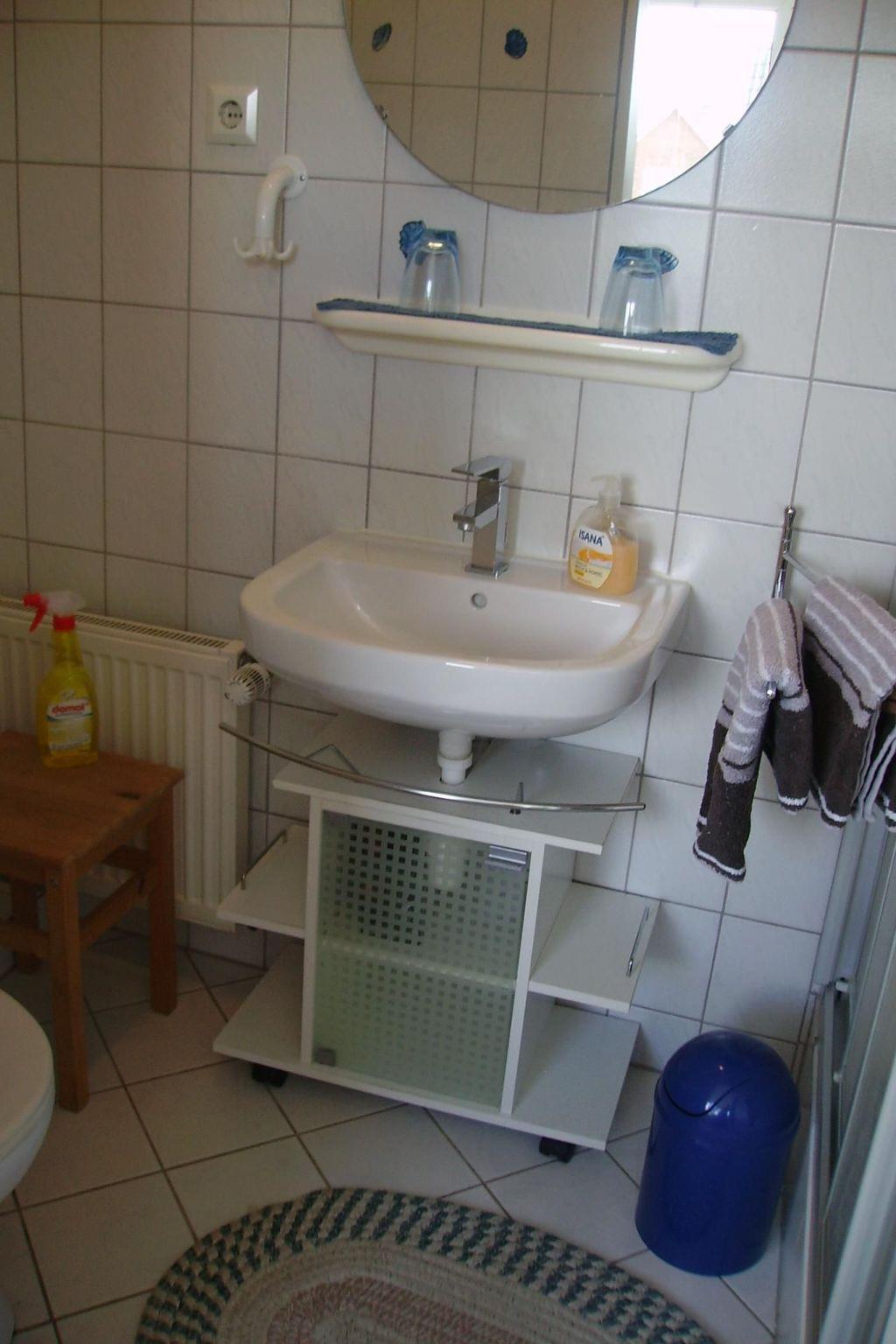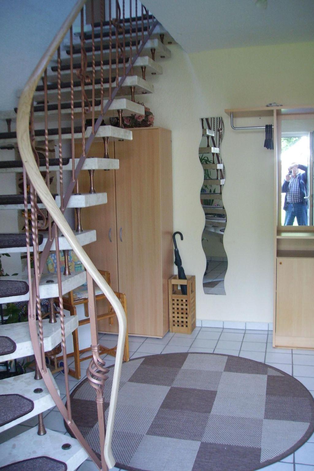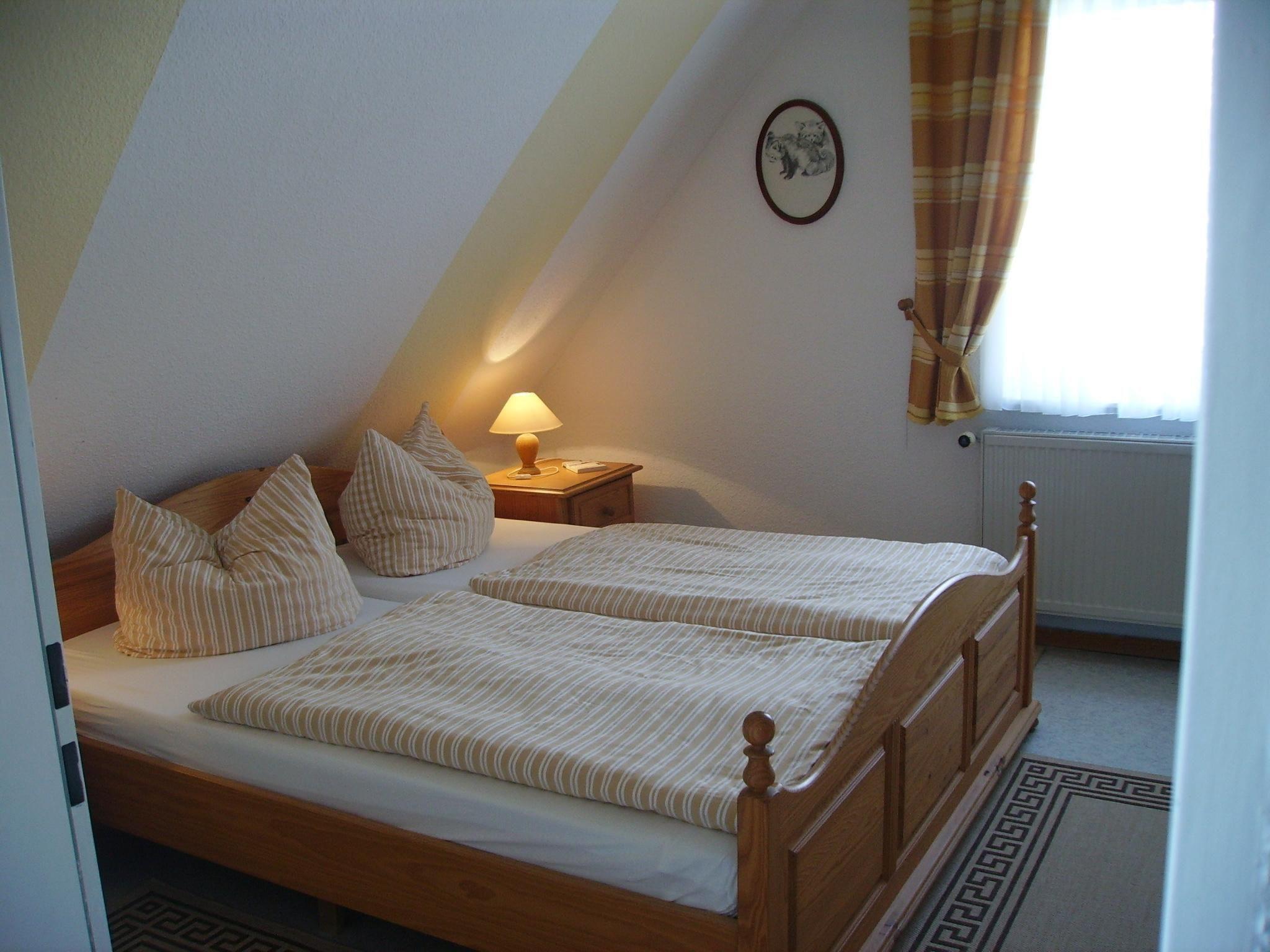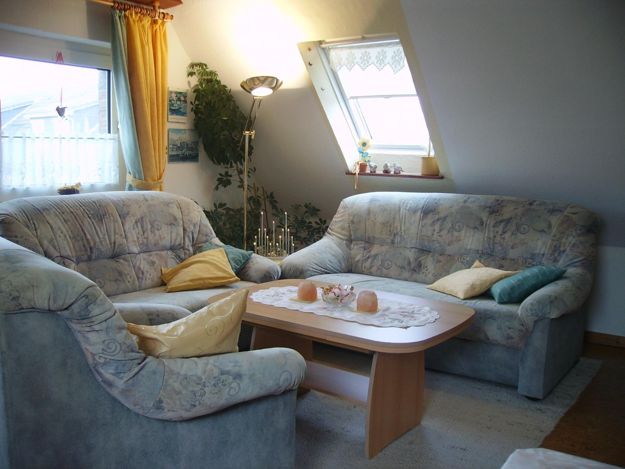 The separate entrance on the ground floor leads to an entrance hall with cloakroom. A staircase leads to the upper floor of the holiday flat. To the right is the bedroom with double bed (200x190) and a single bed (90x200), straight ahead is the kitchen area with fitted kitchen. To the left of the kitchen area is the bathroom and straight ahead through the kitchen area you enter the cosy living room with dining area. WLAN is available. The flat has gas central heating.