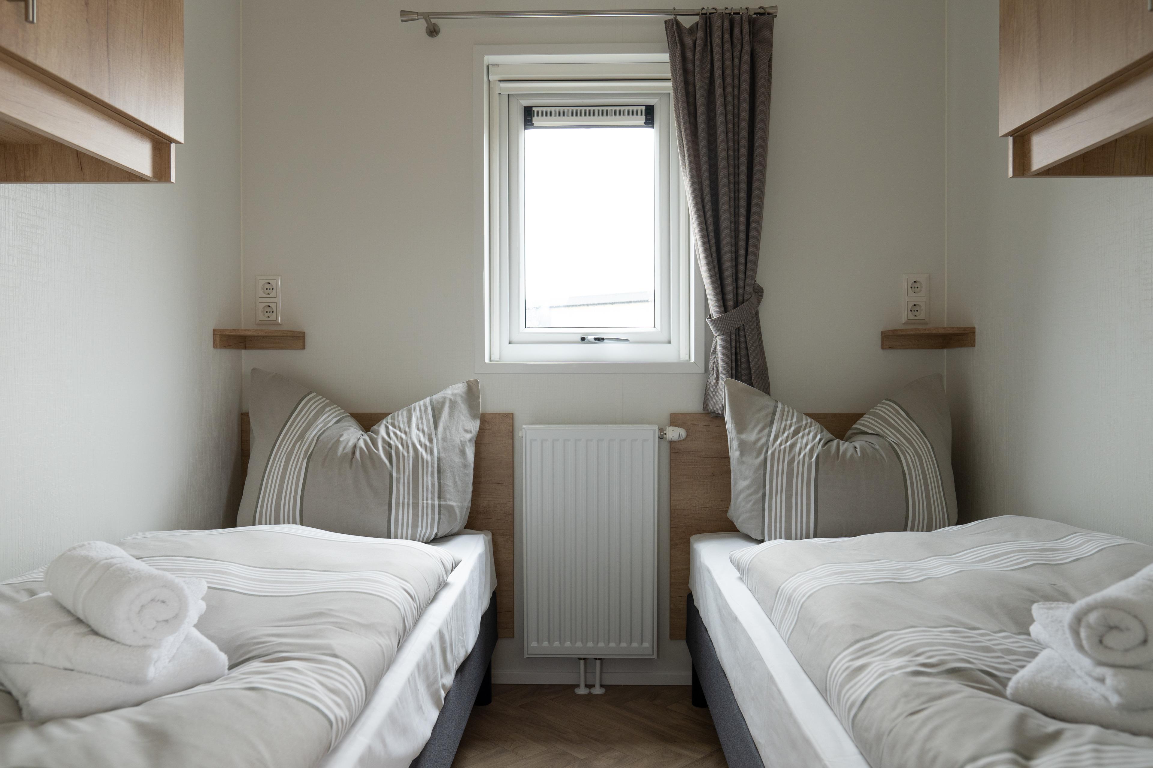 Ferienhaus mit rd. 52m² und Platz für bis zu sechs Personen. Drei Schlafzimmer (eins mit Doppelbett, eins mit zwei Einzelbetten und eins mit Etagenbett), ein Badezimmer, großer Wohnraum mit Küche, Sitzgelegenheiten und Unterhaltungsmedien (TV). Im Außenbereich gibt es einen Stellplatz für Ihr Auto und die Terrasse lädt zum gemütlichen Verweilen ein. Die Chalets befinden sich in einem eigenen Parkareal unseres Platzes mit eigener Zufahrt.