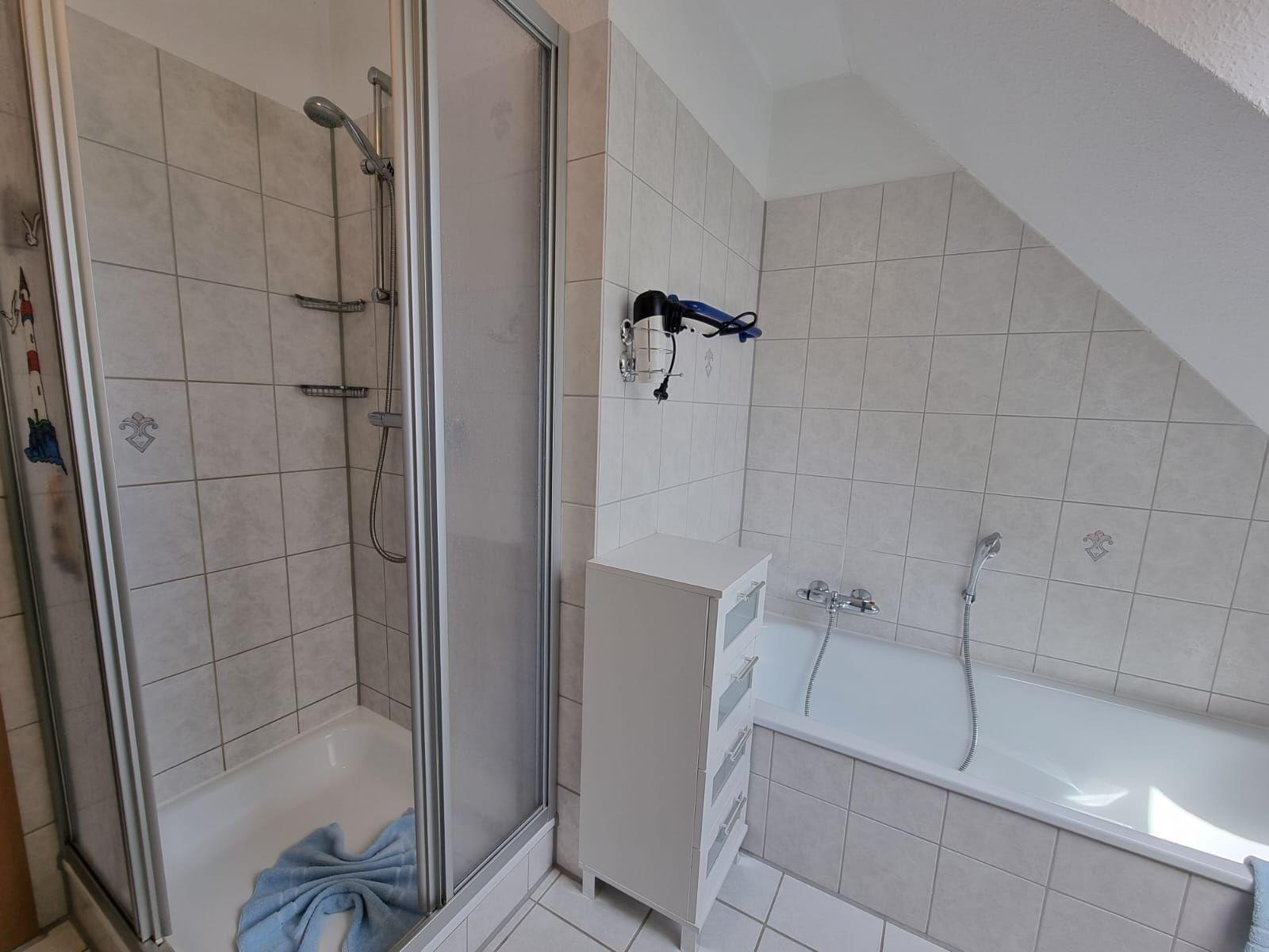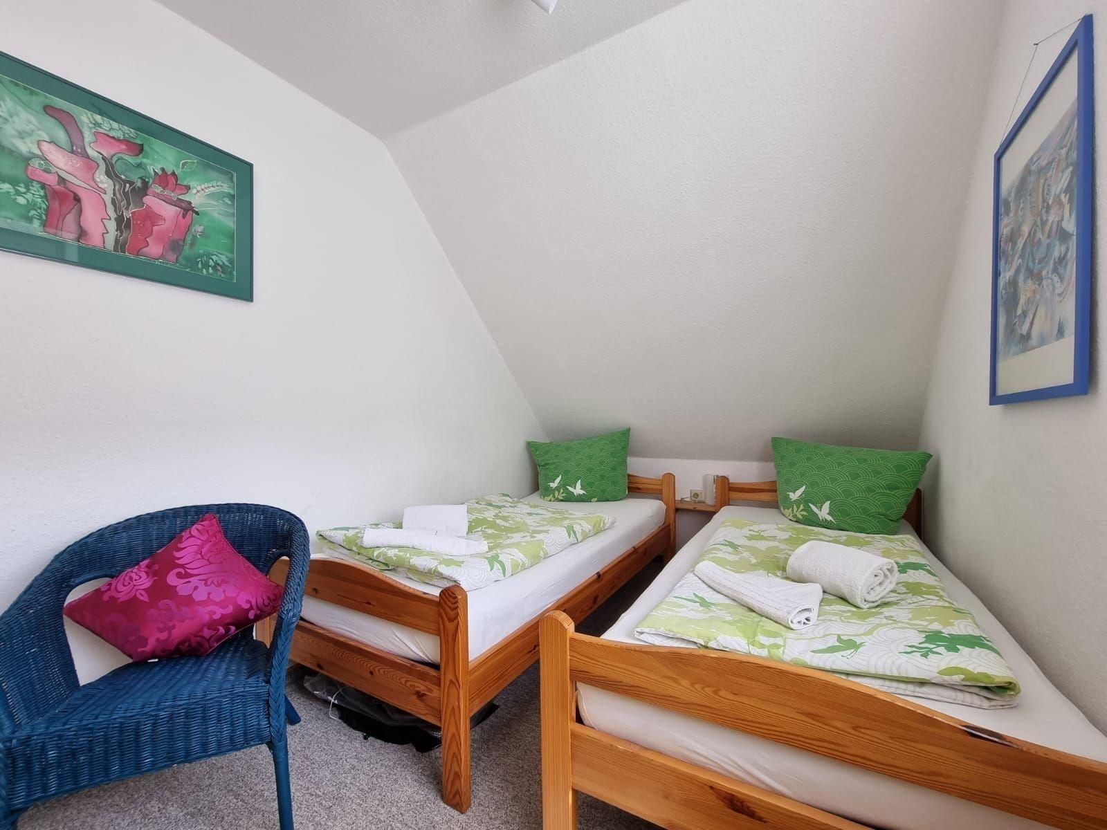 Zwei Schlafzimmer bieten optimale Schlafmöglichkeiten: ein Schlafzimmer mit Doppelbett und Kinderbett sowie ein weiteres mit zwei Einzelbetten. Ein Wohnschlafzimmer mit Schlafcouch ergänzt die Unterkunft. Das Badezimmer im Obergeschoss ist mit Badewanne und Dusche ausgestattet, zudem steht ein Gäste-WC im Erdgeschoss zur Verfügung. Weitere Annehmlichkeiten wie WLAN, Parkplatz und ein Starterset sorgen für zusätzlichen Komfort. Die Wohnung ist allergikergeeignet und ausgestattet mit verschiedenen Haushaltsgeräten.