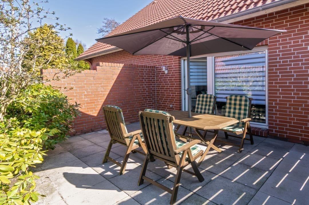 Vom Wohnbereich aus gelangen Sie zudem direkt auf die Terrasse. Sie ist nach Westen ausgerichtet und somit perfekt, um die letzten Sonnenstrahlen zu genießen und Ihren Urlaubstag in einer gemütlichen Runde zu beschließen. Die Bestuhlung im Außenbereich ist für vier Personen ausgelegt.