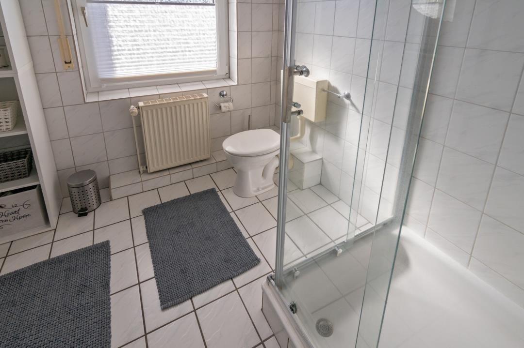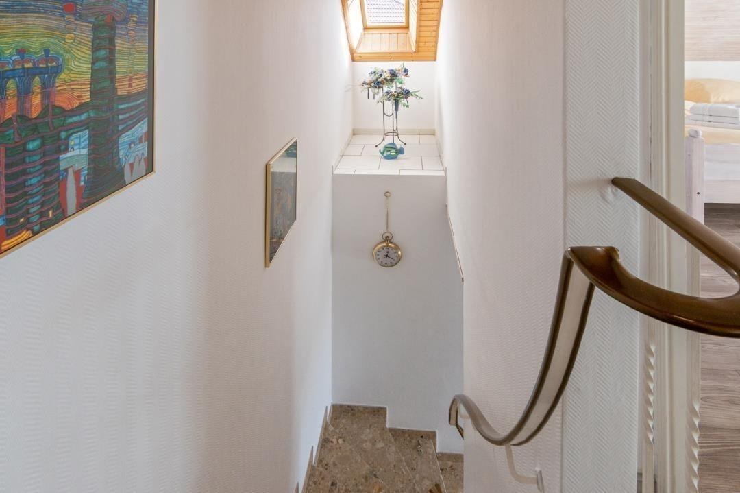 Über die Treppe gelangen Sie ins Obergeschoss. Hier befinden sich zwei Schlafräume, die jeweils mit einem 180 x 200 cm großen Doppelbett ausgestattet sind. Beide Räume verfügen über einen großen Kleiderschrank und ein TV-Gerät. In einem der Schlafräume finden Sie zudem einen gemütlichen Sessel vor. Ebenfalls im Obergeschoss liegt das große und gut ausgestattete Tageslichtbad mit Dusche, WC, Wasch-Spiegel-Kombination und einer Waschmaschine. Selbst an den praktischen Haartrockner wurde bei der Ausstattung gedacht.