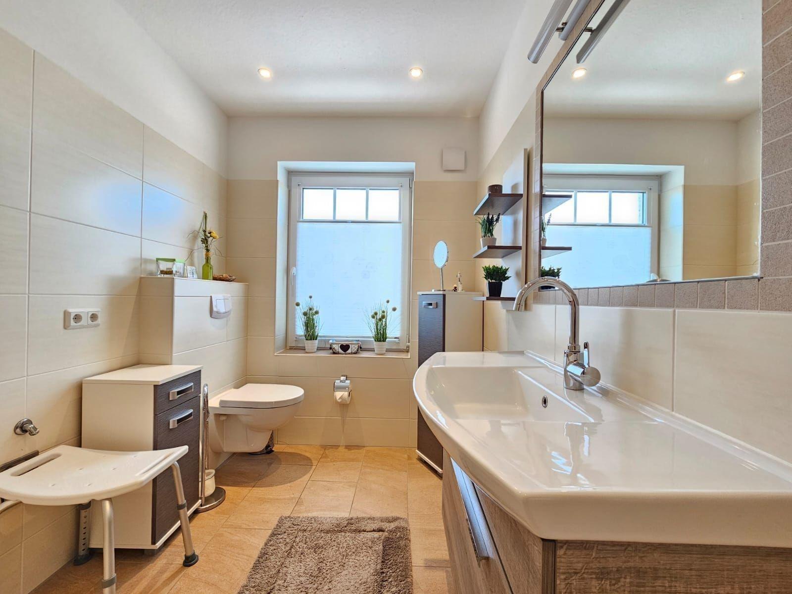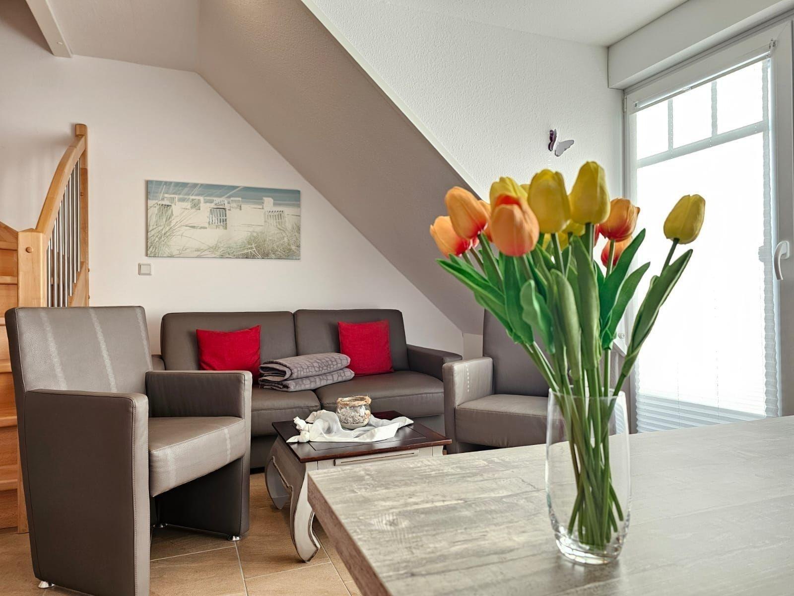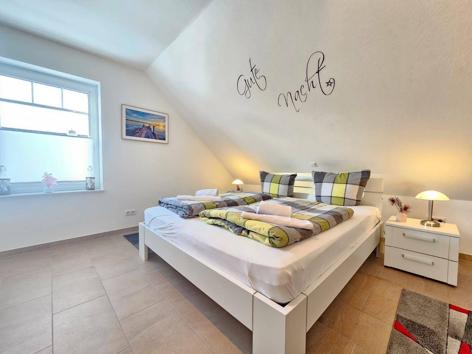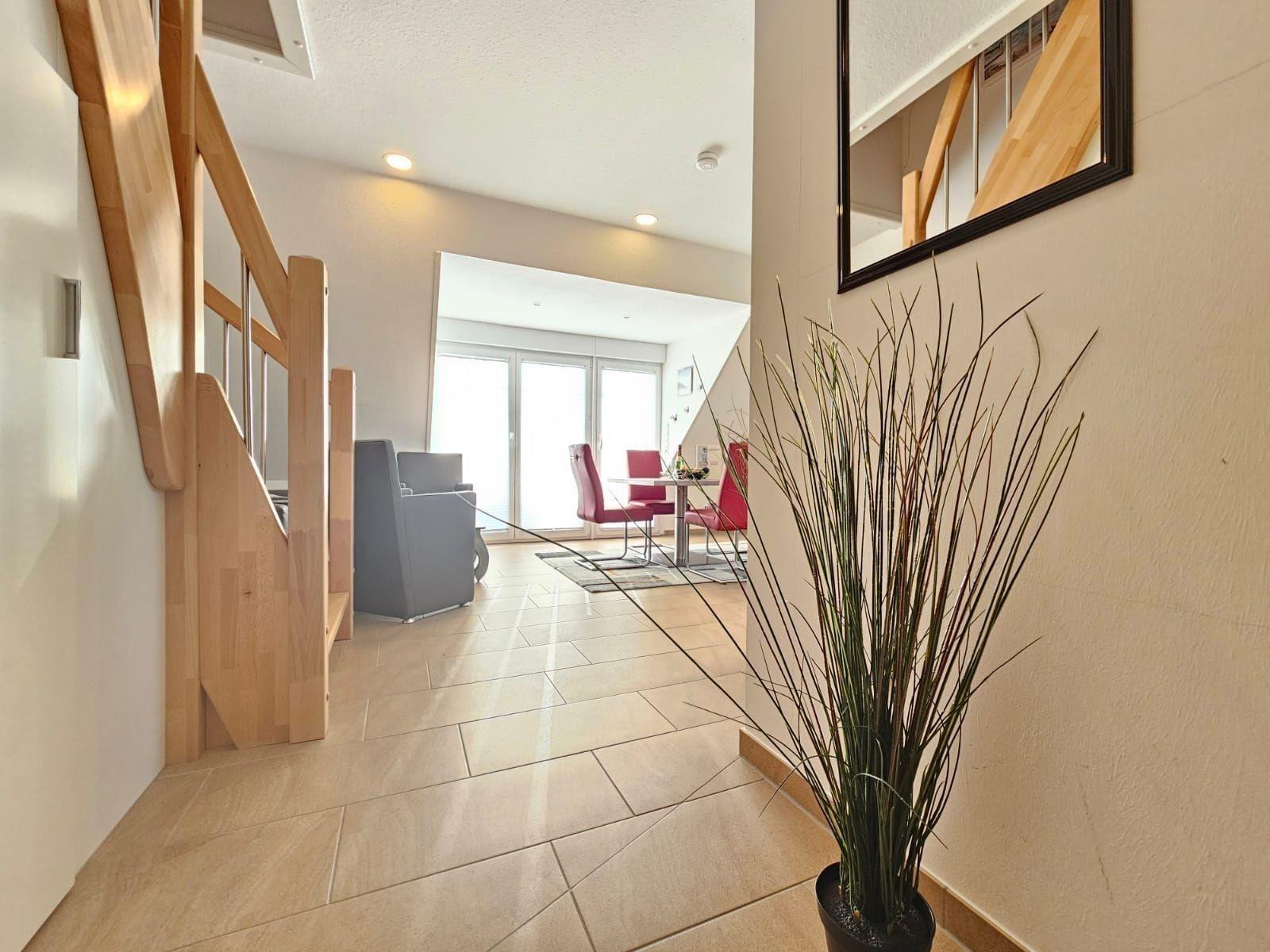 Die Ferienwohnung bietet einen einladenden Rückzugsort, ideal für Familien oder Gruppen. Mit zwei Schlafzimmern, ausgestattet mit einem Doppelbett und zwei Einzelbetten, findet jeder den perfekten Schlafplatz. Die offene Küche ist modern gestaltet und verfügt über einen Elektro-/Gasherd, Geschirrspüler, Backofen, Mikrowelle, Kühlschrank sowie eine Kaffeemaschine und einen Toaster. Für das Wohl der Gäste sorgt die allergikerfreundliche Ausstattung und ein Badezimmer mit Fenster, bodengleicher Dusche sowie einem umfangreichen Starterset. Die helle, freundliche Wohnlandschaft mit Sofa, Sessel und Esstisch lädt zum Verweilen ein. WLAN steht kostenfrei zur Verfügung, und ein Parkplatz ist direkt vor der Tür. Zusätzliche Annehmlichkeiten wie ein Haartrockner, TV, Bügeleisen und Reinigungsmittel runden das Angebot ab. Diese Ferienwohnung ist ein perfekter Ort für entspannte Urlaubstage.