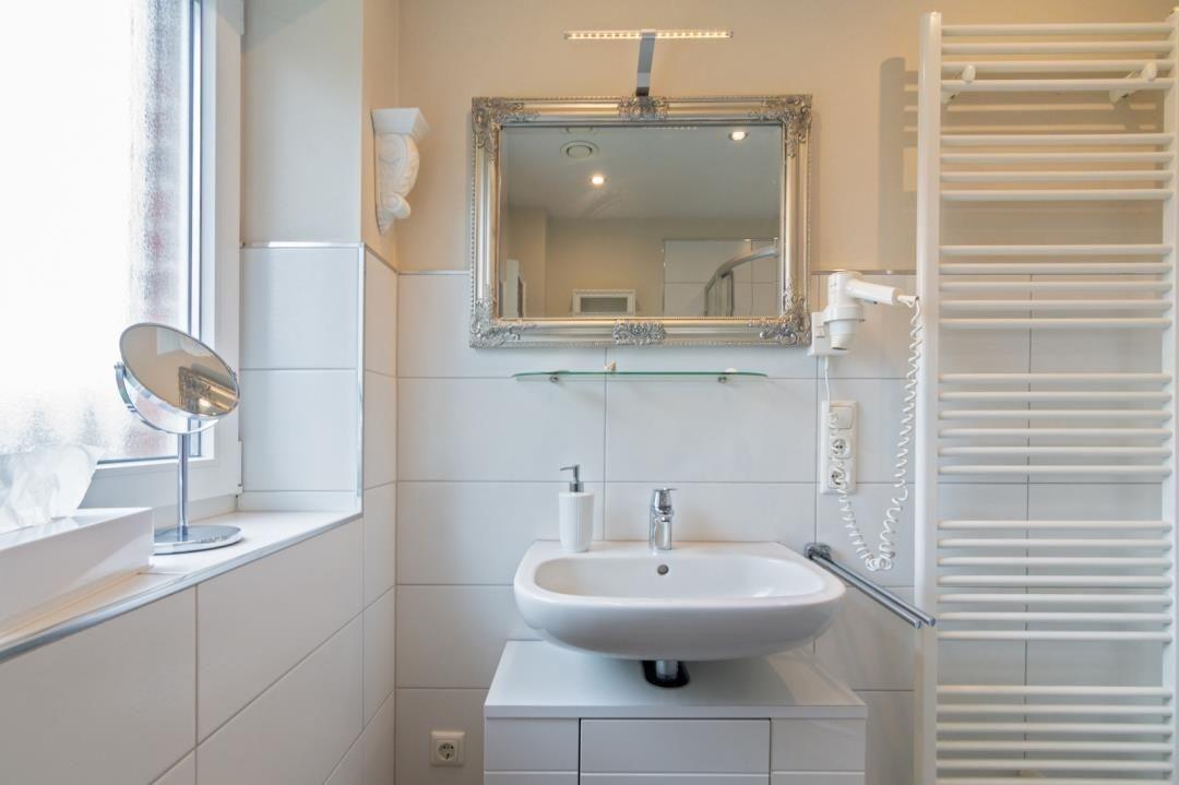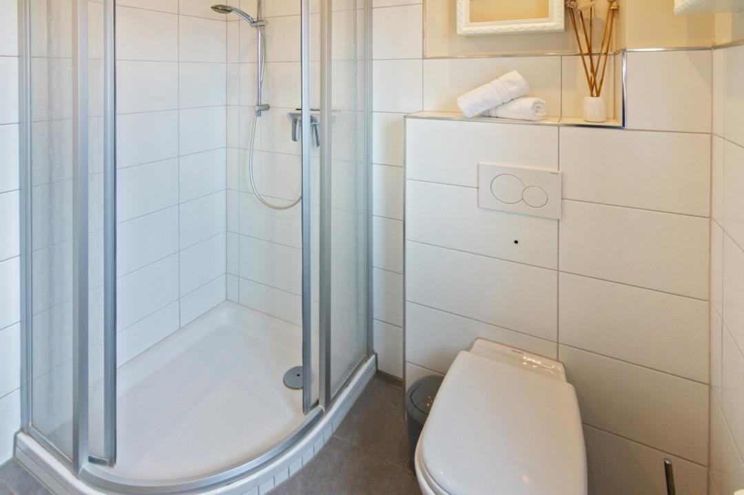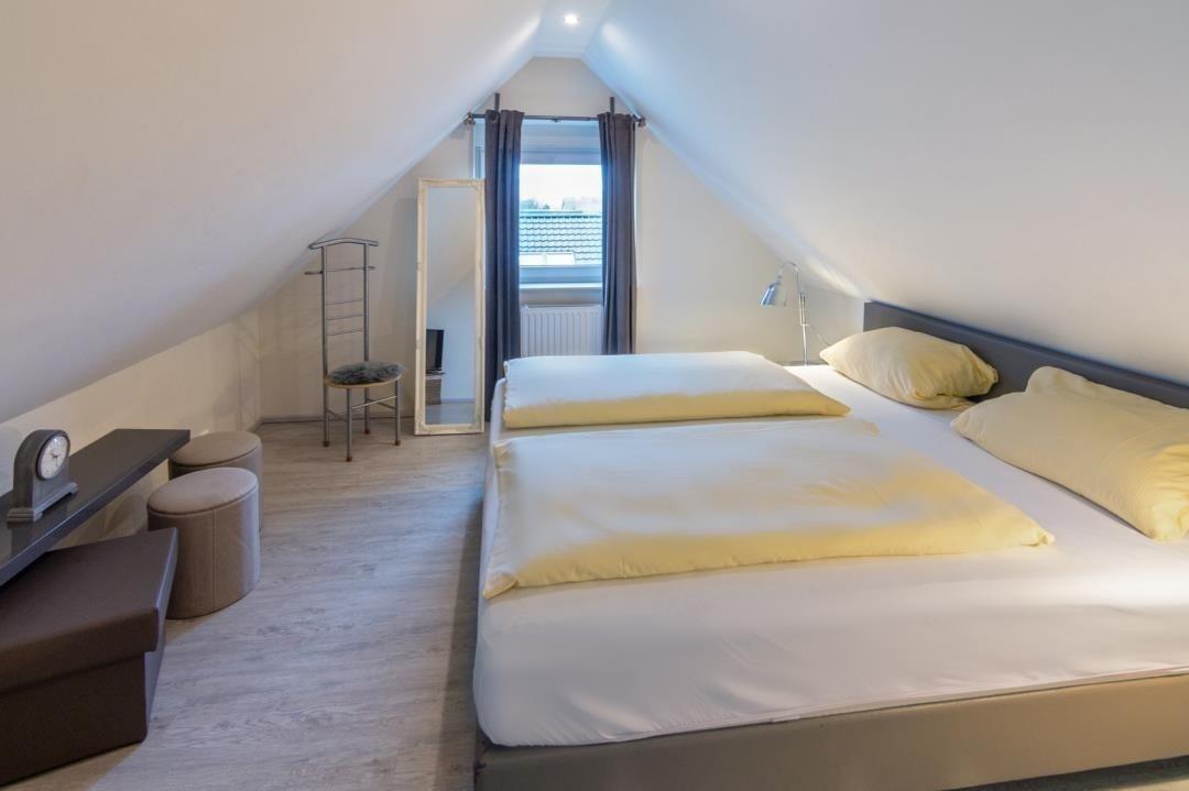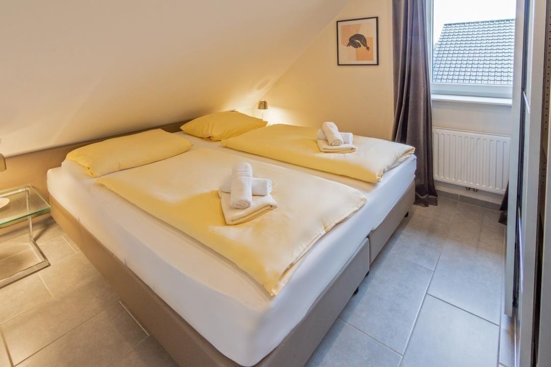 Ihr „zweites Zuhause" befindet sich im Obergeschoss eines geschmackvollen Reihenhauses in herrlich ruhiger Wohnlage und ist für vier Erwachsene konzipiert. Die gemütliche Ferienwohnung erstreckt sich über Ober- und Dachgeschoss und ist nicht nur ein Ort der Ruhe, sondern auch des stilvollen Komforts. Der großzügige Wohnbereich kombiniert Küchen-, Ess- und Wohnraum und überzeugt mit seinem offenen Konzept und der Shabby-Chic-Einrichtung, die zum Verweilen einlädt. Die moderne Küchenzeile ist bestens ausgestattet mit einem Herd, Spülmaschine, Kühlschrank, Mikrowelle, einem Backofen sowie allen notwendigen Utensilien, die Sie für die Zubereitung Ihrer Speisen benötigen. Ein großer, einladender Tisch bietet genügend Platz und bildet das Zentrum für Ihre gemütlichen Mahlzeiten. Entspannung finden Sie im stilvollen Wohnbereich, wo eine Couch und ein Fernseher gegenüber dem Balkonzugang für unterhaltsame oder gemütliche Abende sorgen. Das Schlafzimmer verfügt über ein komfortables Doppelbett (ca. 180 × 200 cm), wird komplettiert durch Nachttische und Lampen, sowie einem geräumigen Kleiderschrank mit eingebautem Tresor für Ihre Wertgegenstände. Ein weiterer Schlafraum befindet sich im Dachgeschoss und ist über eine Holztreppe im Wohnbereich erreichbar. Auch hier erwartet Sie ein großzügiges Doppelbett, ein großer Kleiderschrank und Nachttische mit Lampen. Ein zusätzlicher Fernseher ergänzt diesen Raum. Beide Schlafzimmer verfügen über eine Verdunkelungsmöglichkeit durch Rollläden. Das Tageslicht-Badezimmer bietet mit seiner Dusche, WC und einem handtuchtrockenen Heizkörper jeden Komfort, den man sich für einen erfrischenden Start in den Tag oder entspannenden Ausklang am Abend wünscht. Neben dem Wohnraum hält die Wohnung auch eine praktische Kammer bereit, ausgestattet mit Waschmaschine, Putzzeug und Staubsauger – alles, was Sie für einen sorgenfreien Aufenthalt benötigen. Das Obergeschoss und das Bad sind durchgehend gefliest und das Dachgeschoss verfügt über einen Vinylboden in Holzoptik, was eine eventuell benötigte Reinigung beider Ebenen besonders einfach macht.