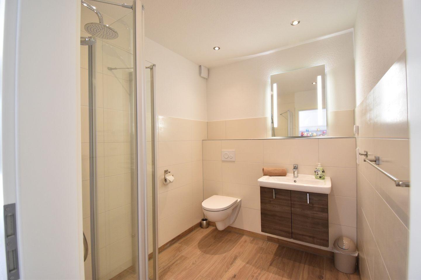 Das Bad mit bodentiefer Dusche, WC und Waschtisch rundet den Grundriss ab.