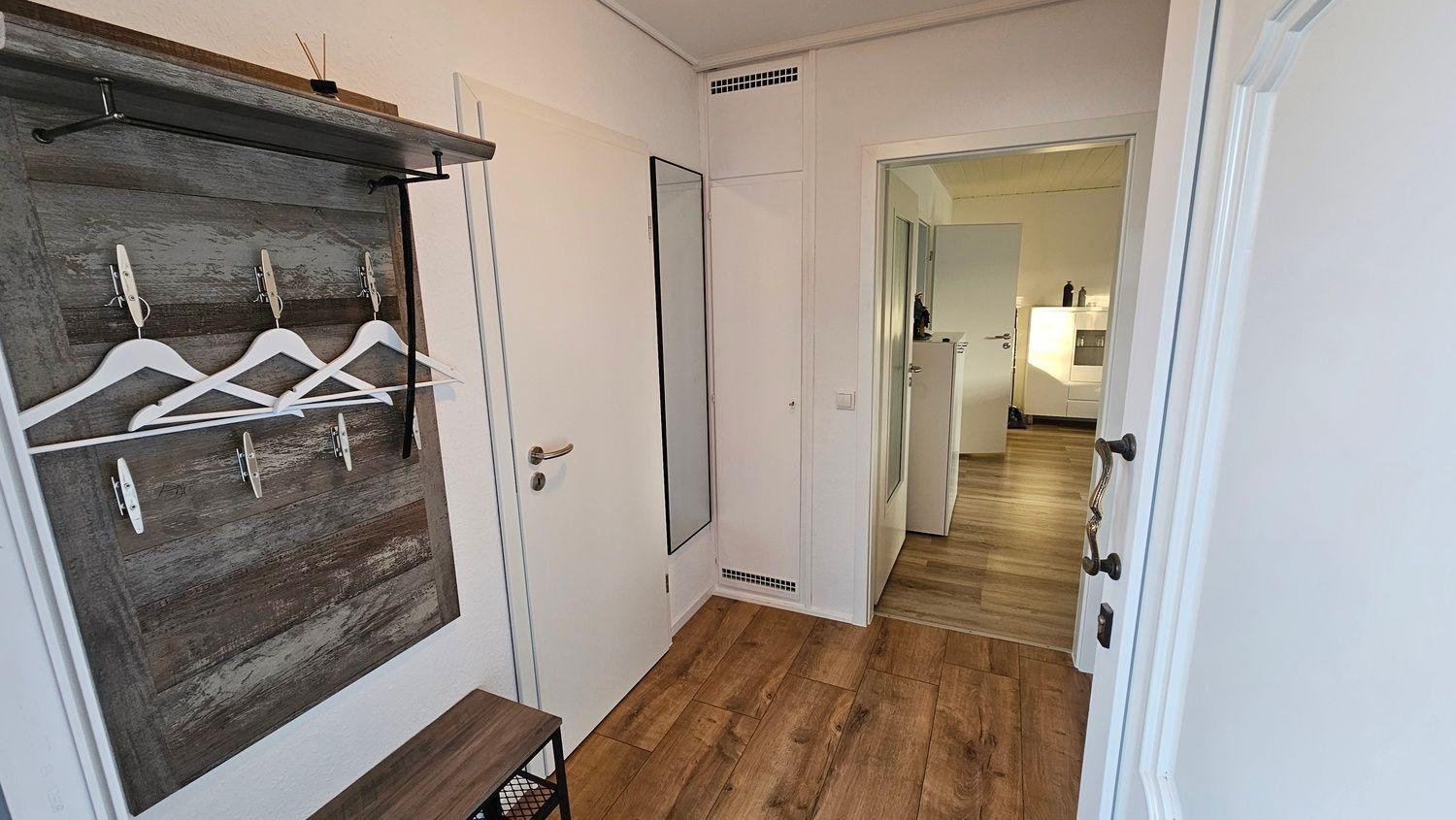 Der Eingangsbereich bietet Ihnen die Möglichkeit Ihre Jacken an die Garderobe zu Hängen und die Schuhe im Schuhregal unterzubringen.
