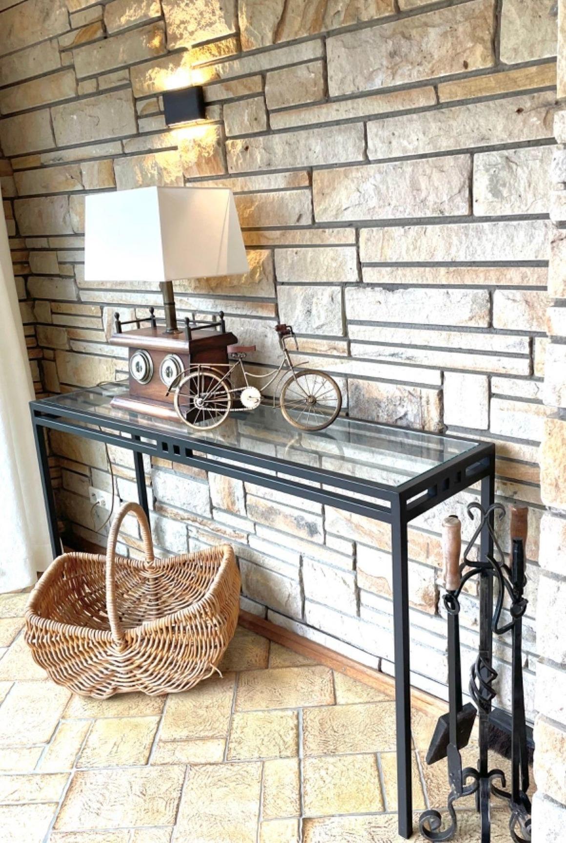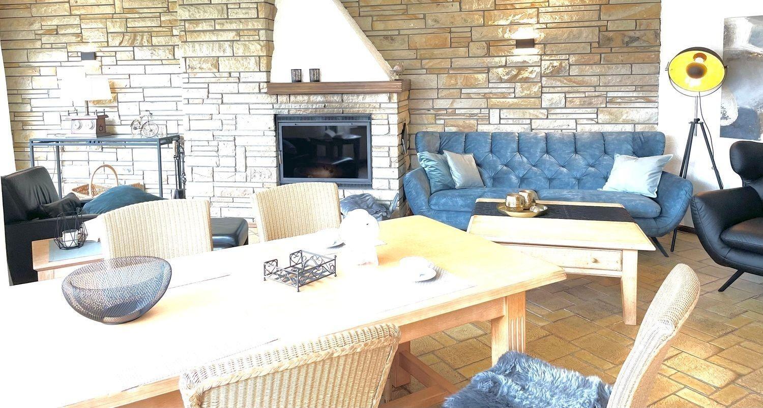 In der Wand aus Naturstein befindet sich der Kamin, der zu gemütlichen Abenden am knisternden Feuer einlädt.