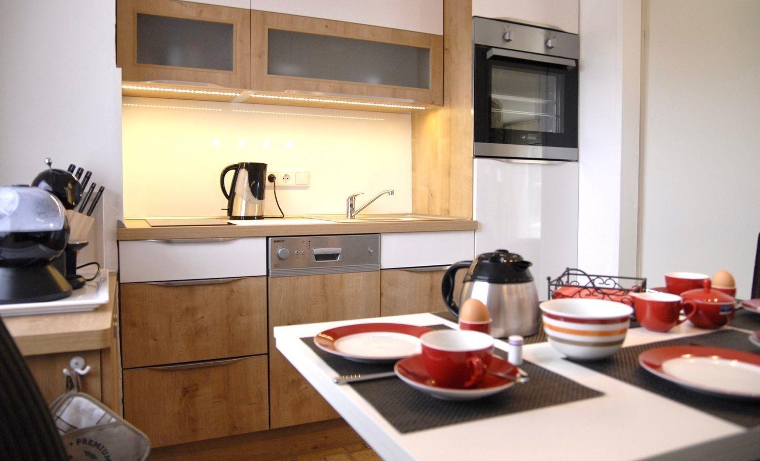 Die hochwertige Küchenzeile bietet einen Geschirrspüler, ein Ceranfeld und weitere Annehmlichkeiten, wie Filterkaffeemaschine und Senseo Kaffeepad-Maschine. Es gibt vielfältige Küchenutensilien. Geschirr ist neu und reichlich vorhanden. In