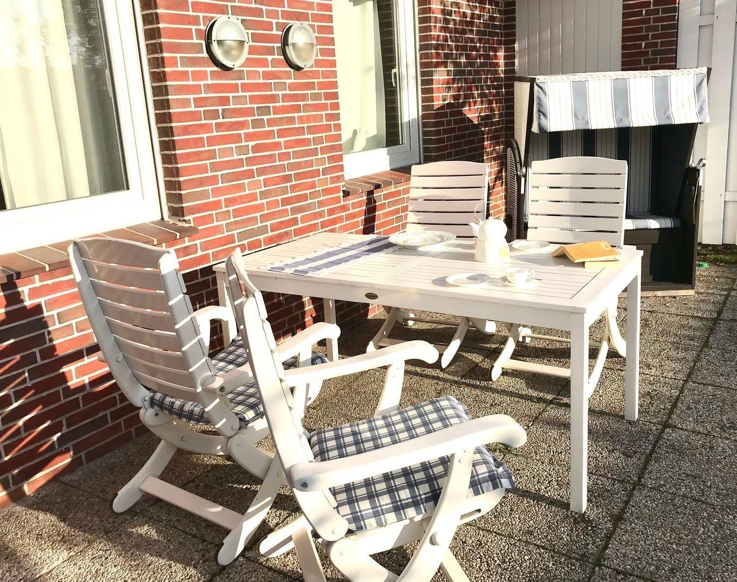 Zusätzlich gibt es einen Sonnenschirm. Zum Sonnenbaden stehen 2 Nadir Liegen, 1 Kettler- und 1 Bäderliege zur Verfügung. Die Terrasse ist optimal windgeschützt und lässt meist ab Ostern wunderbare Sonnenbäder zu. Es gibt einen großen Gartengrill.