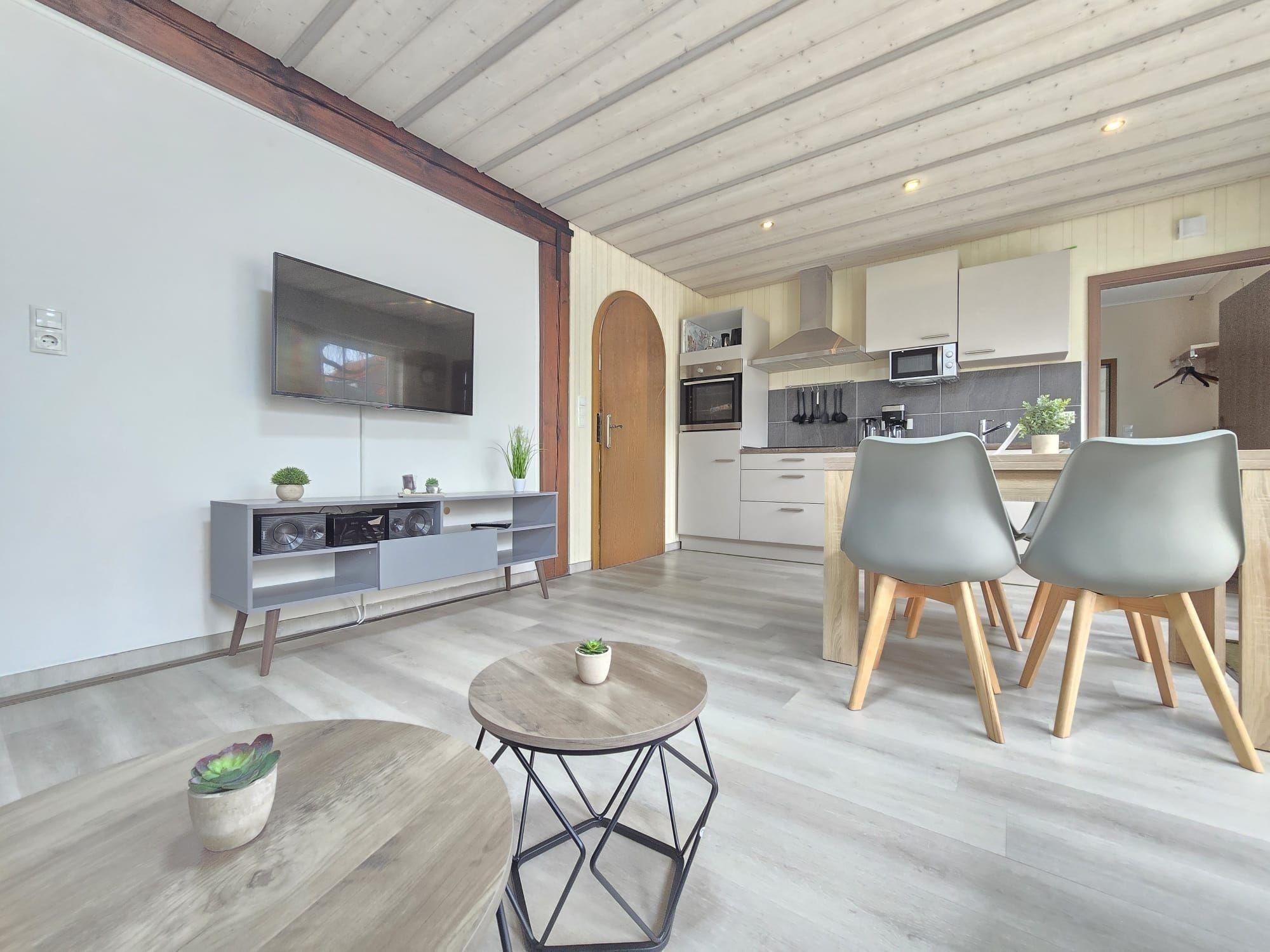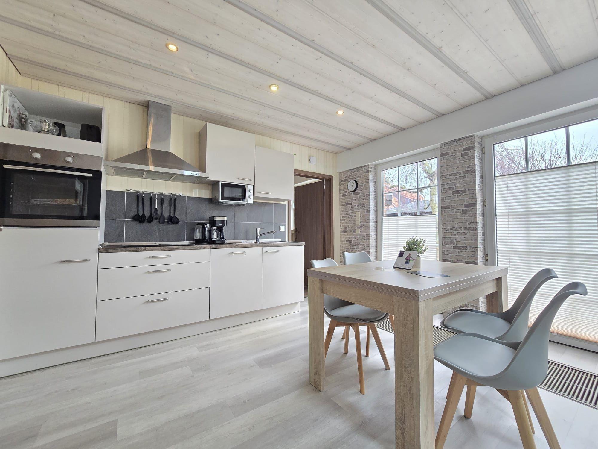 Die Ferienwohnung bietet eine moderne und allergikerfreundliche Ausstattung für einen komfortablen Aufenthalt. Sie verfügt über zwei gemütliche Schlafzimmer mit je einem Doppelbett, ideal für Familien oder Paare. Die offene Küche ist mit einem Geschirrspüler, Elektro- und Gasherd, Mikrowelle, Kühlschrank, Kaffeemaschine und Toaster bestens ausgestattet. Ein Esstisch lädt zum gemeinsamen Speisen ein. Im großzügigen Badezimmer mit Fenster sorgt eine bodengleiche Dusche für viel Komfort. Die Wohnung ist mit WLAN ausgestattet und verfügt über eine HiFi-Anlage sowie einen TV für entspannende Abende. Zu den Annehmlichkeiten gehören auch ein Parkplatz, Waschmaschine, Wäschetrockner und ein Starterset mit grundlegenden Hygieneartikeln. Für die kleinen Gäste steht ein Kinderhochstuhl zur Verfügung. Reinigungsmittel, Geschirrtücher und Geschirr sind ebenfalls vorhanden, sodass nichts dem erholsamen Urlaub im Wege steht.