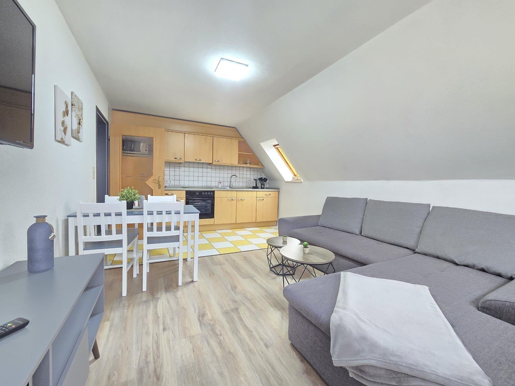Diese moderne Ferienwohnung bietet eine optimale Ausstattung für entspannte Aufenthalte. Sie verfügt über ein Schlafzimmer mit einem komfortablen Doppelbett sowie ein Wohnschlafzimmer mit einer Schlafcouch, die zusätzlichen Platz bietet. Die offene Küche ist komplett ausgestattet mit Elektro-/Gasherd, Backofen, Kühlschrank, Mikrowelle und Kaffeemaschine, sodass die Zubereitung von Mahlzeiten unkompliziert ist. Der Esstisch lädt zu gemeinsamen Mahlzeiten ein. Im Duschbad mit Fenster befindet sich ein Starterset mit Seife und Duschgel. Die Wohnung ist allergikergeeignet und bietet WLAN-Internet für den direkten Zugang zur digitalen Welt. Zur weiteren Ausstattung gehören eine HiFi-Anlage, TV, Waschmaschine, Wäschetrockner und ein Parkplatz direkt vor der Tür. Die gemütlichen Sitzmöglichkeiten mit Sofa und Sessel sowie die Heizung sorgen für Wohlfühlatmosphäre, während Reinigungsmittel und Gewürze das Herumexperimentieren in der Küche erleichtern.