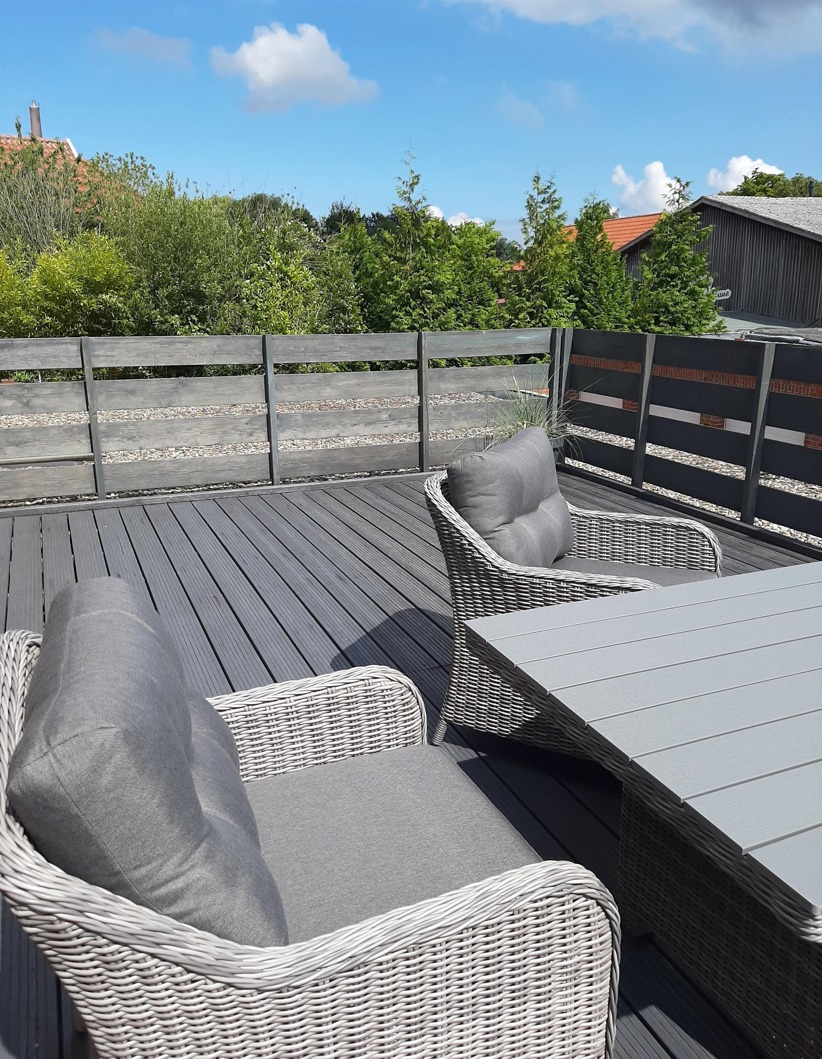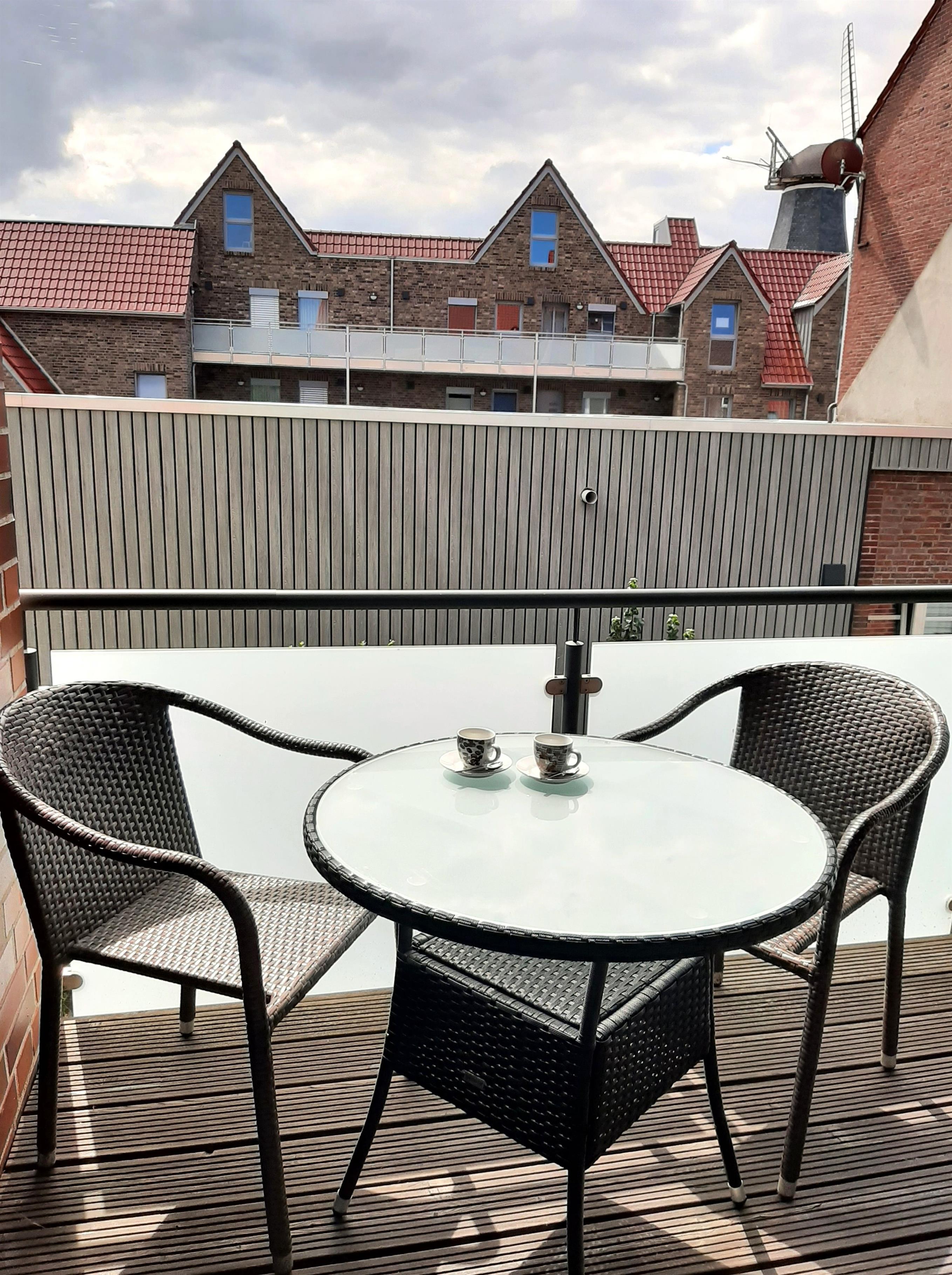 Die Dachterrasse ist das Highlight dieser Ferienwohnung und bietet einen herrlichen Blick auf die umliegende Umgebung, mit besonders beeindruckendem Blick auf die historische Windmühle – ein perfektes Fotomotiv und ein einzigartiger Anblick.