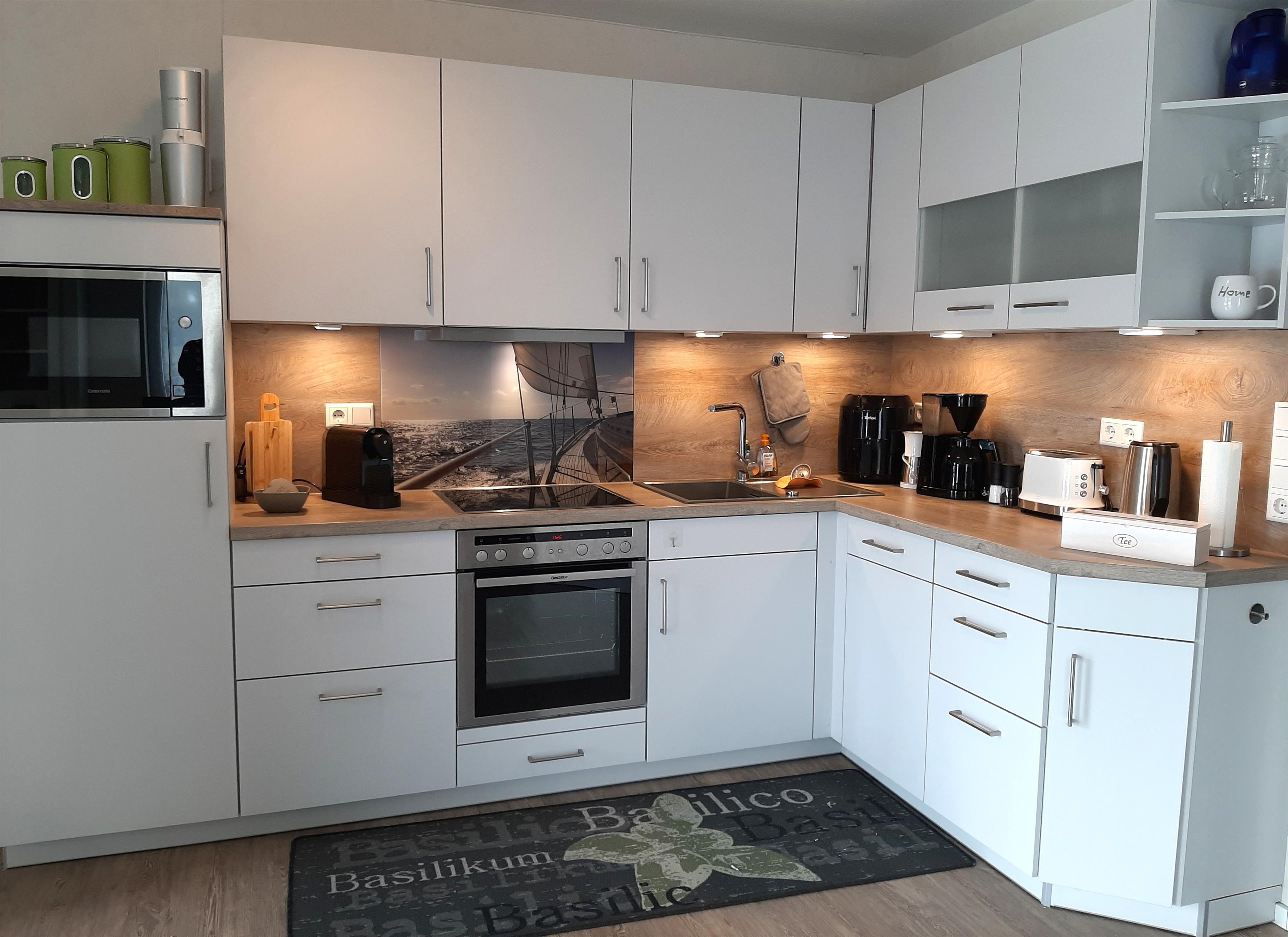 Das Herzstück der Ferienwohnung bildet der großzügige Wohn- und Essbereich mit offener, umfangreich ausgestatteter Küche. Ein großes, bequemes Ecksofa und ein zusätzlicher Sessel bieten reichlich Platz zum Entspannen – ob mit einem guten Buch, beim Fernsehen oder für gemütliche Abende zu zweit oder mit der Familie.