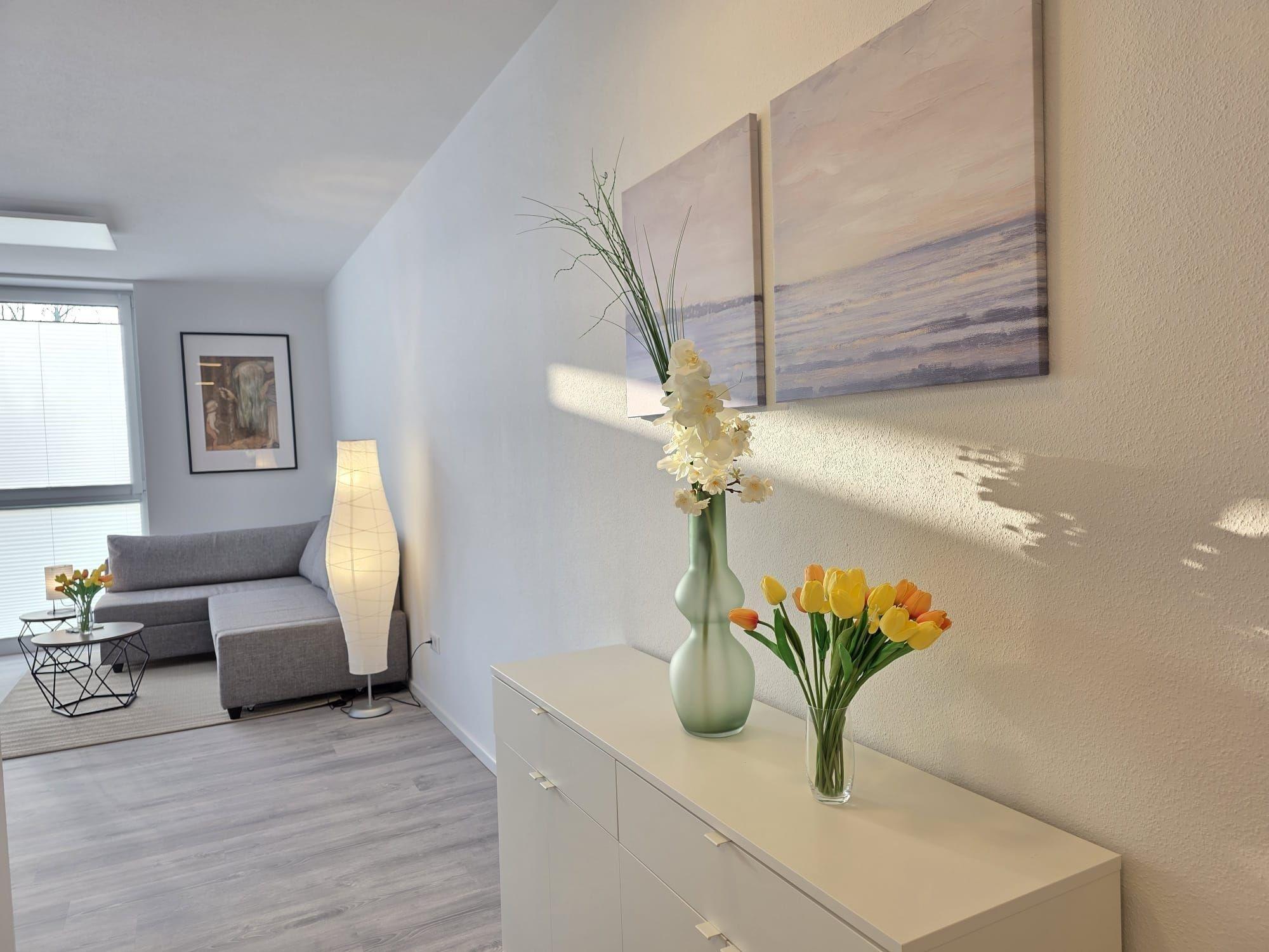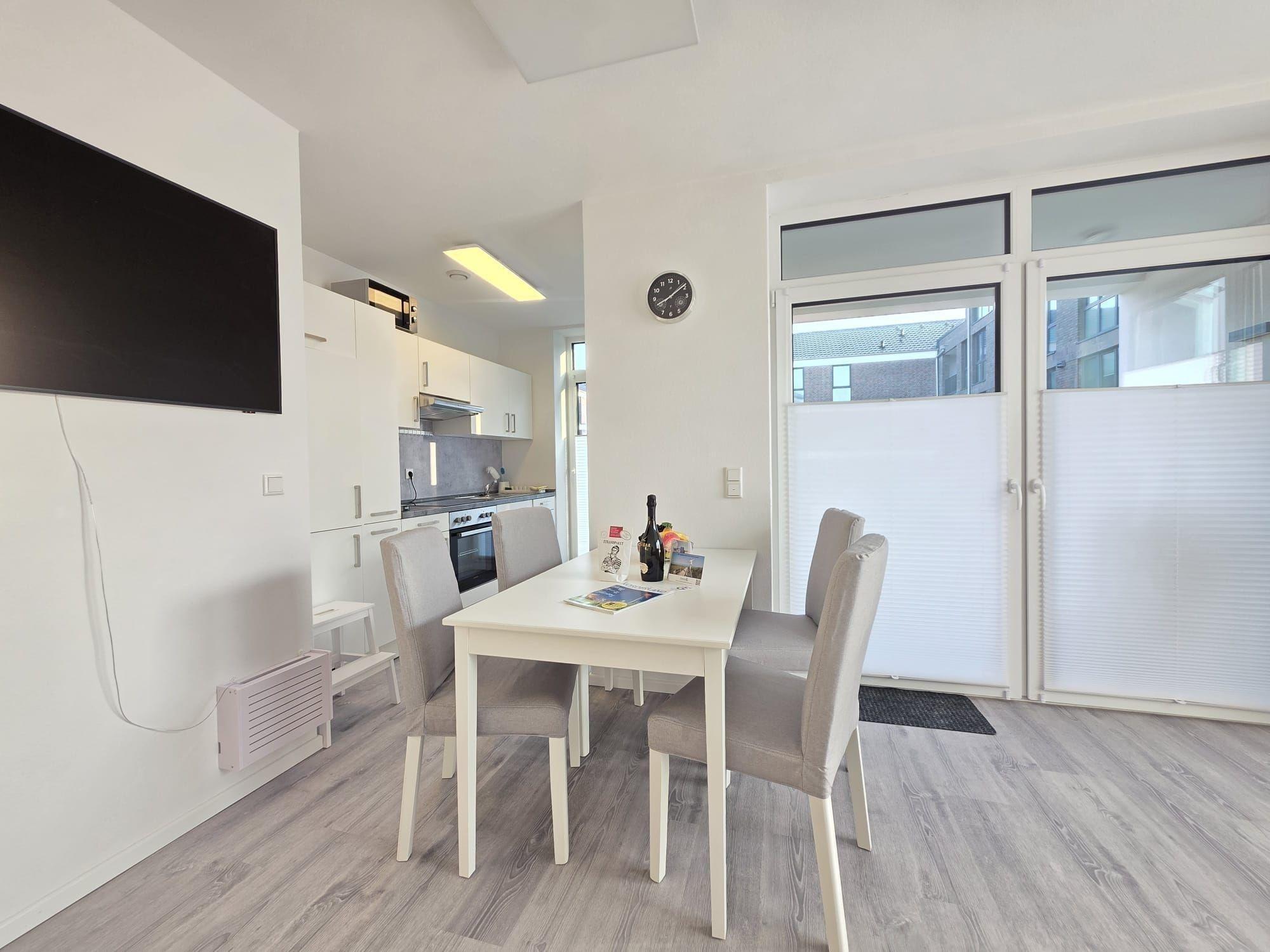 Der helle Wohnbereich enthält eine große Sofalandschaft, die bei Bedarf als zusätzliche Schlafmöglichkeit genutzt werden kann, sowie einen Esstisch und eine moderne, voll ausgestattete Küche. Die große Terrasse mit seitlichem Blick auf das Norder Tief lädt zu entspannten Stunden im Freien ein. Die Innenstadt von Norden ist fußläufig erreichbar, was die Ferienwohnung NordTroll zu einem idealen Ausgangspunkt für einen erholsamen Nordseeurlaub macht.