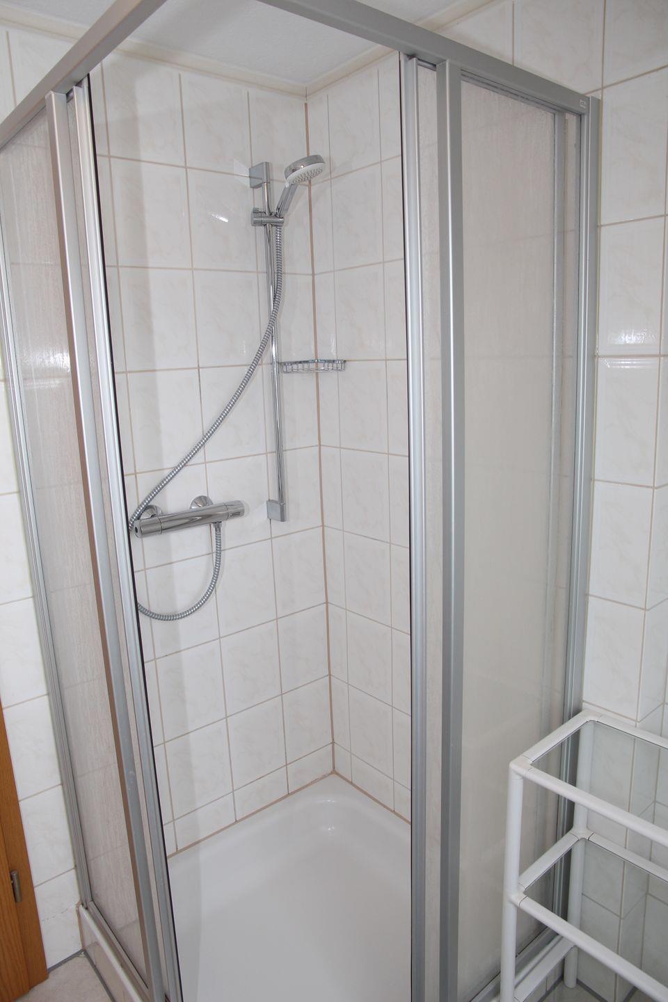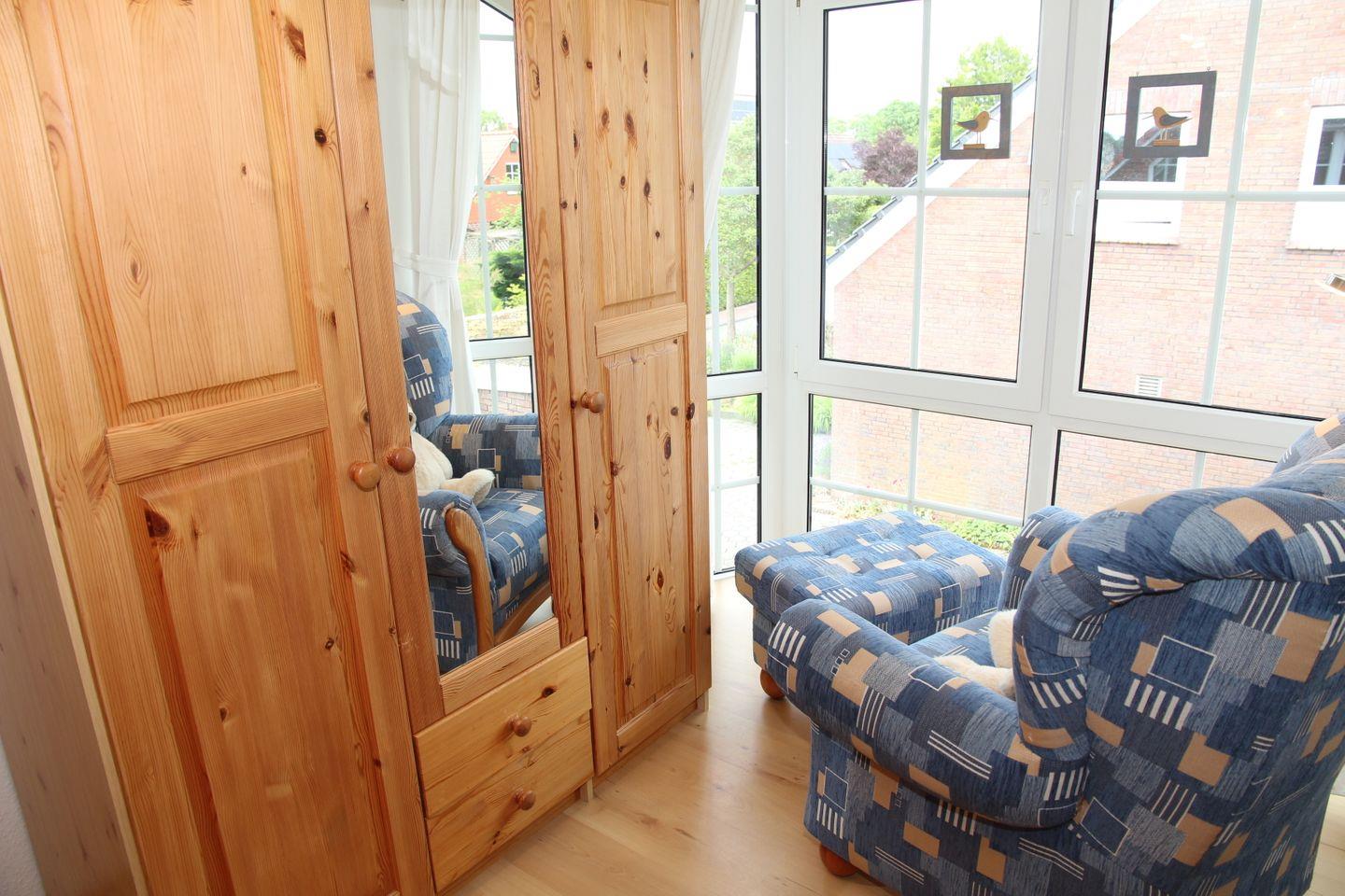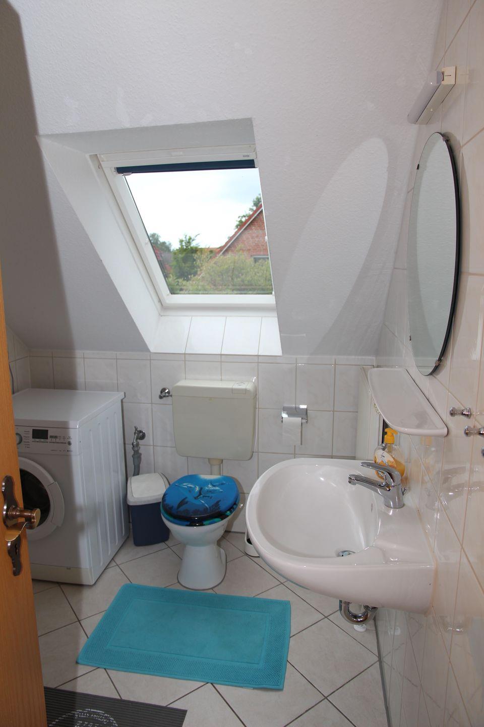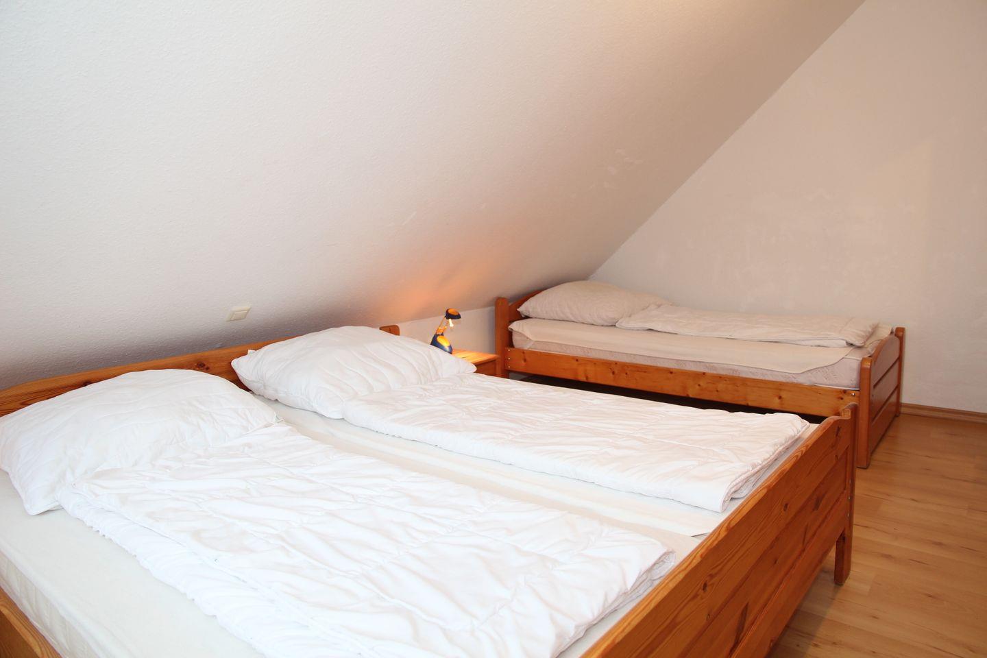 Im Obergeschoss (mit Laminat ausgelegt) befinden sich 2 Schlafzimmer (ein SZ mit Doppelbett und ein Einzelbett, ein Schlafzimmer mit 2 Einzelbetten) und ein Duschbad mit WC und Waschmaschine. Eine Bodenerwärmung sorgt dort für zusätzliche Behaglichkeit. Zum Haus gehört eine Terrasse mit Mobiliar (6 Stühle, 2 Liegen, 2 Kippliegen, Sonnenschirm) und ein großer Garten mit einem Blockbohlenhaus (ideal um Fahrräder unterzustellen).
