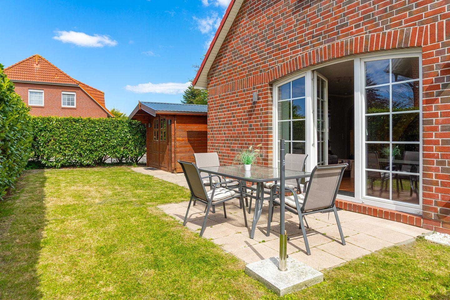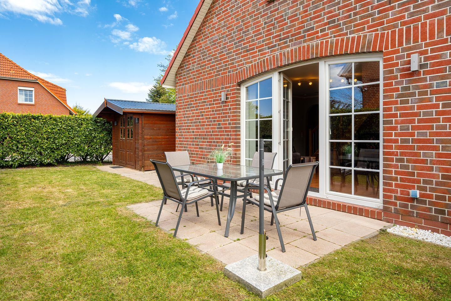 Zum Haus gehört eine möblierte Terrasse, ein Grill und ein großes Gartenhaus für evtl. mitgebrachte Fahrräder.