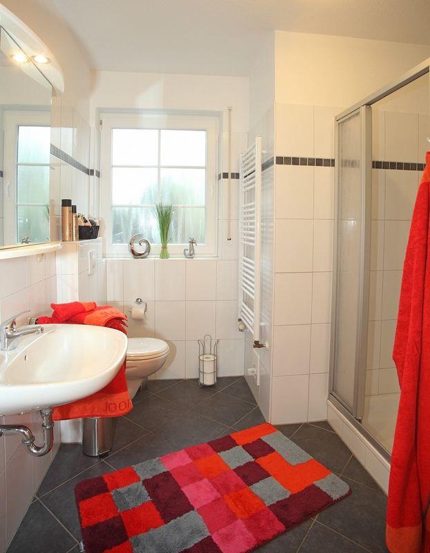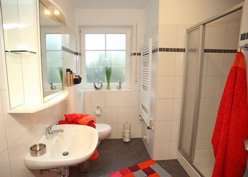 Zusätzlich gibt es im Erdgeschoss ein geräumiges modernes Bad mit extra großer Dusche. Selbstverständlich sind auch eine Waschmaschine, ein Trockner sowie Bügeleisen und Bügelbrett vorhanden. Auch befindet sich in jedem Bad ein Fön.