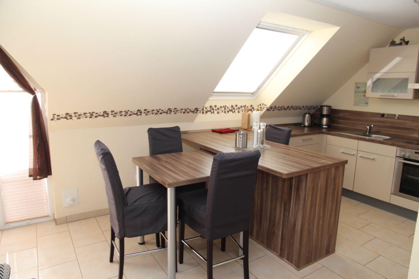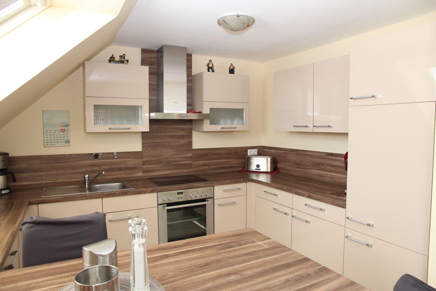 Großer Wohn-Essbereich mit SAT-TV, Musikanlage, CD-Player und einer Einbauküche mit reichhaltiger Ausstattung: Cerankochfeld, Backofen, Mikrowelle, Geschirrspülmaschine, Kühl-/Gefrierkombi, Cafissimo, Kaffeemaschine, Wasserkocher, Eierkocher, Toaster u.v.m.