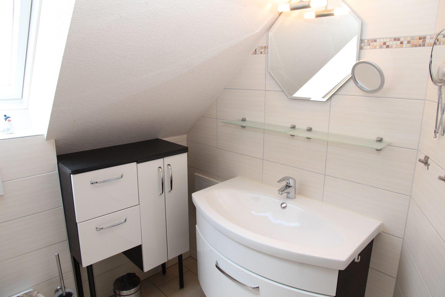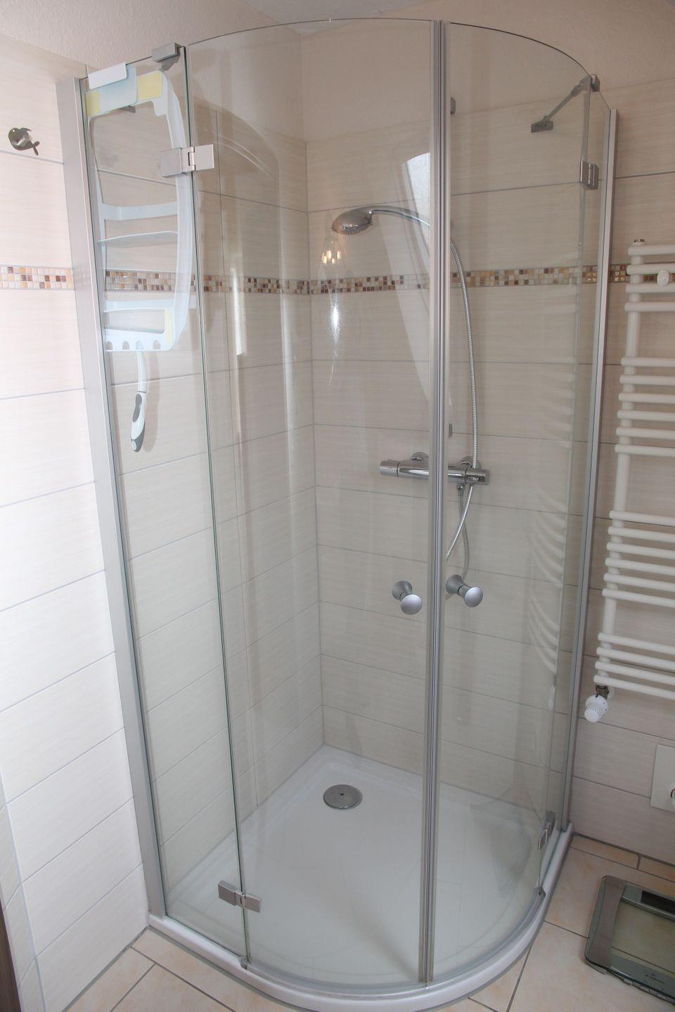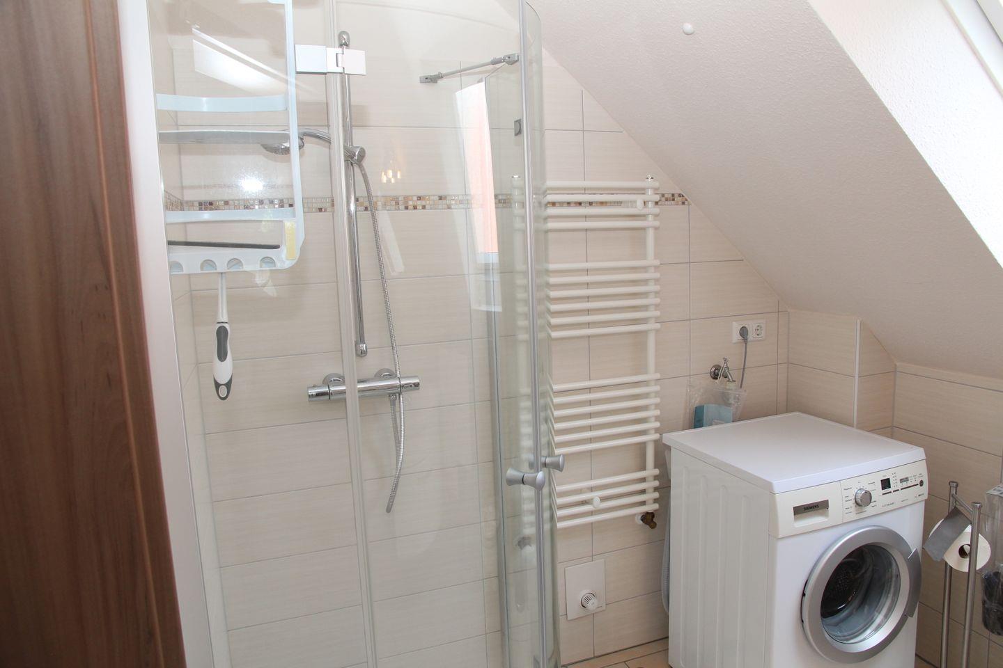 Es gibt ein komfortables Duschbad mit Handtuchtrockner und Waschmaschine.