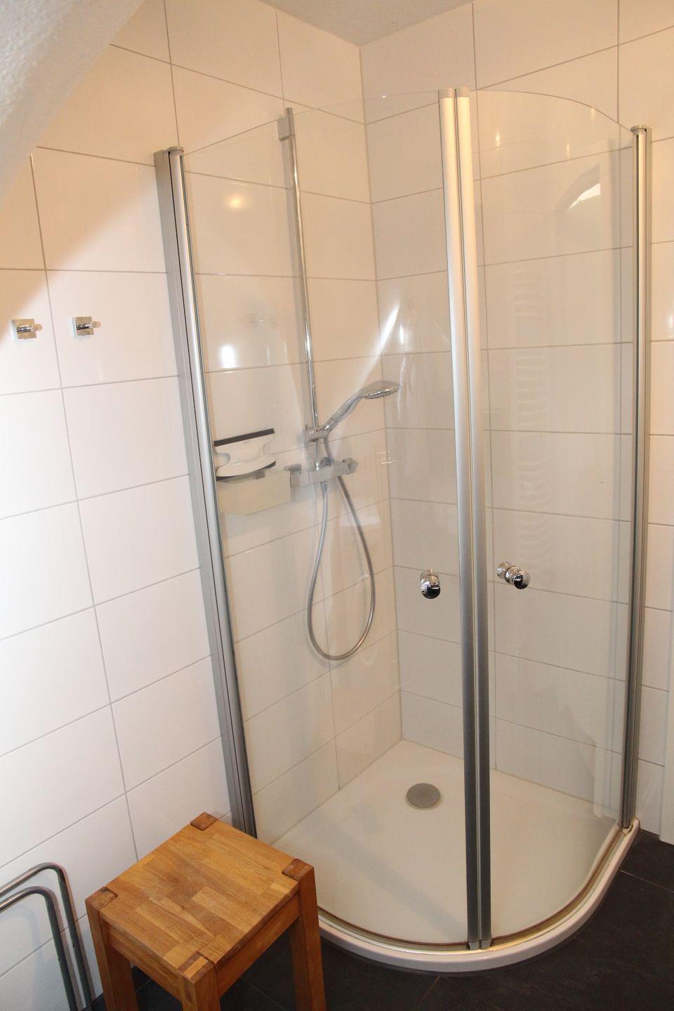 Das Bad ist geschmackvoll und großzügig ausgestattet. Es besitzt zwei Einzelwaschbecken mit großem Wandspiegel und eine Echtglasdusche mit niedrigem Einstieg. Die Toilette befindet sich in einer separaten Räumlichkeit.