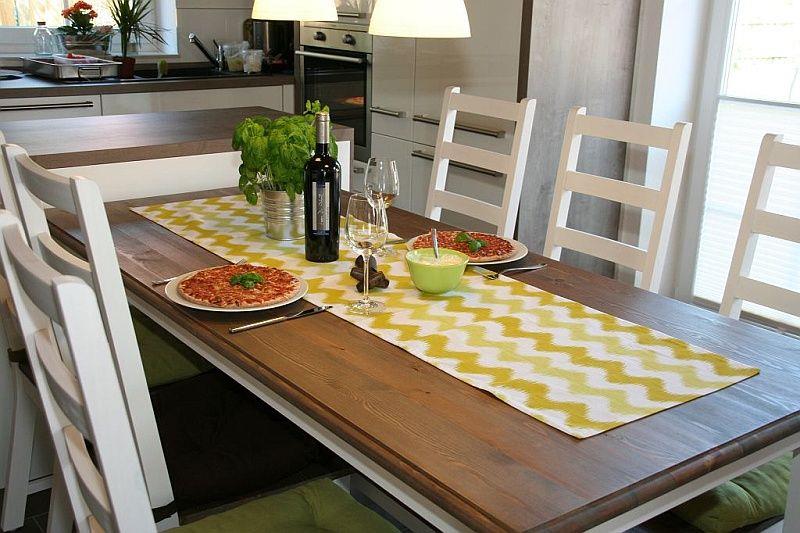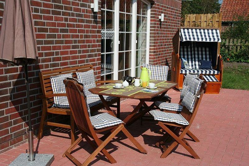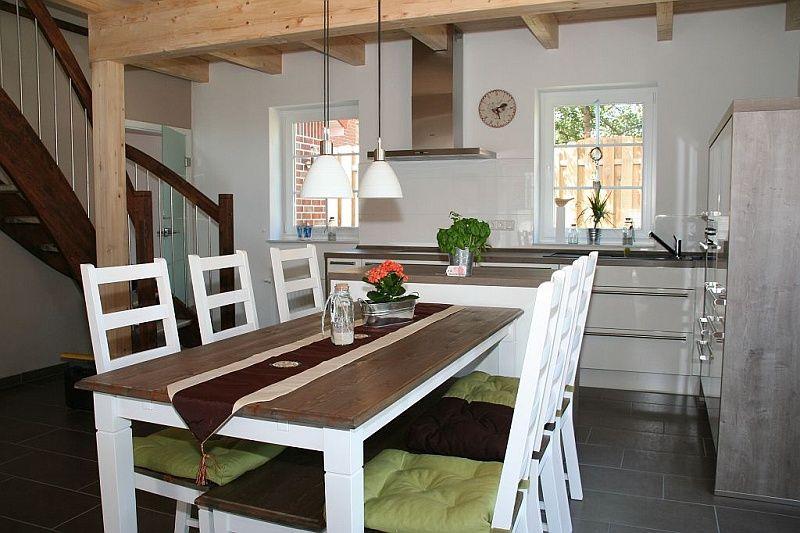 Das frei stehende Friesenhaus für 6 Personen und ein Kleinkind ist im modernen Landhausstil gehalten mit Holzbalkendecke und großem Kaminofen.