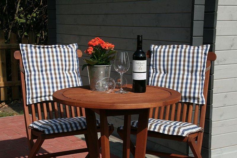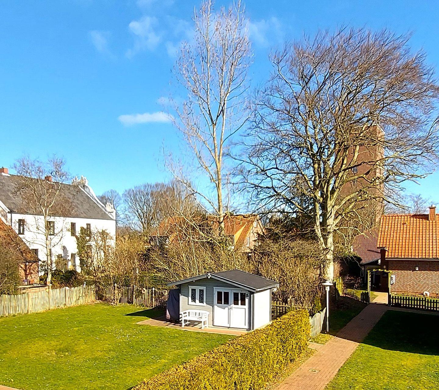 Der geschlossene Garten zur Alleinnutzung und die große Terrasse mit Blick auf den historischen Löwenhof sind mit einem Gartenmöbelset (Holztisch mit Bank, Stühlen und Kissenauflagen), Sonnenschirm, 2 Saunaliegen, und Grill ausgestattet. Hier können Sie in der Morgensonne frühstücken, den Tag genießen oder den Abend nach einem Strandtag in Ruhe ausklingen lassen. Die Sonnenterrasse am Gartenhaus mit Bistro-Tischgarnitur und Strandkorb bietet Gelegenheit, windgeschützt die letzten Sonnenstrahlen zu genießen.