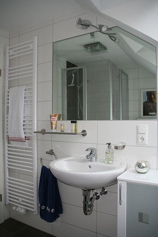 Das zweite Bad im OG mit einer Badewanne und einer Dusche mit niedrigem Einstieg verfügt über ein weiteres WC und ist ebenfalls mit Fußbodenerwärmung und Handtuchtrockner ausgestattet. Ein Föhn ist in beiden Bädern vorhanden.