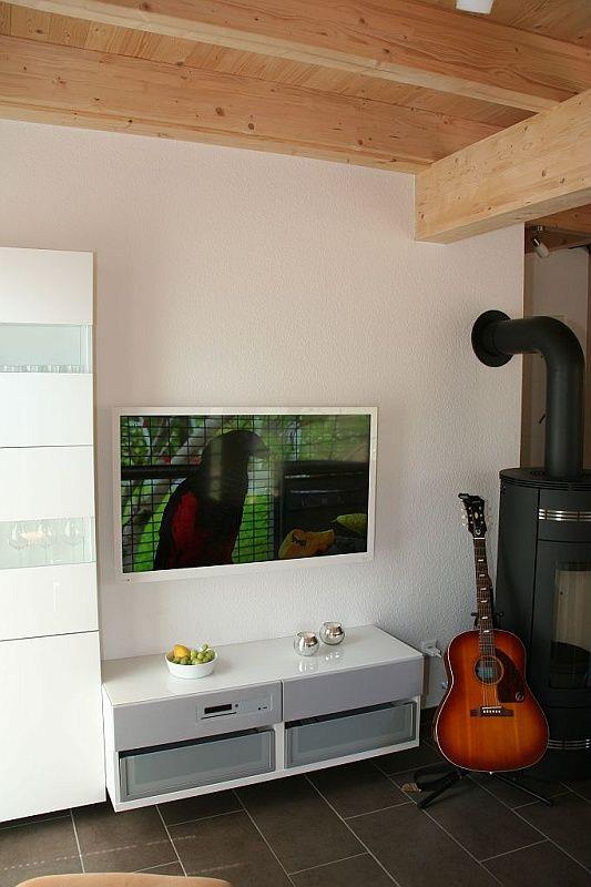 Im Erdgeschoss befindet sich der große Wohn-/ Essbereich, hell und freundlich durch bodentiefe Fenster mit Plissee-Jalousien und gemütlich warm durch Kaminofen und Fußbodenerwärmung. Ein großer Smart-HD-Fernseher mit Soundsystem und integriertem Blu-ray-/DVD-/CD-/MP3-Player, USB-Zugang und Radio für Filme und Musik und der kostenlose W-LAN-Zugang erfüllen alle medialen Wünsche.