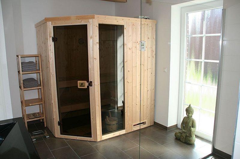 Im Wellness-Bad mit eingebautem Radio, Fußbodenerwärmung, Handtuchtrockner und ebenerdiger (barrierefreier) Regenschauer-Dusche befindet sich auch die Bio-Sauna, die wahlweise als klassisch finnische Sauna oder als Dampfsauna genutzt werden kann. Das geräumige Bad mit Sauna und Gartenzugang auf eine kleine Sauna-Terrasse lädt ganzjährig zu Wellness und Entspannung ein.