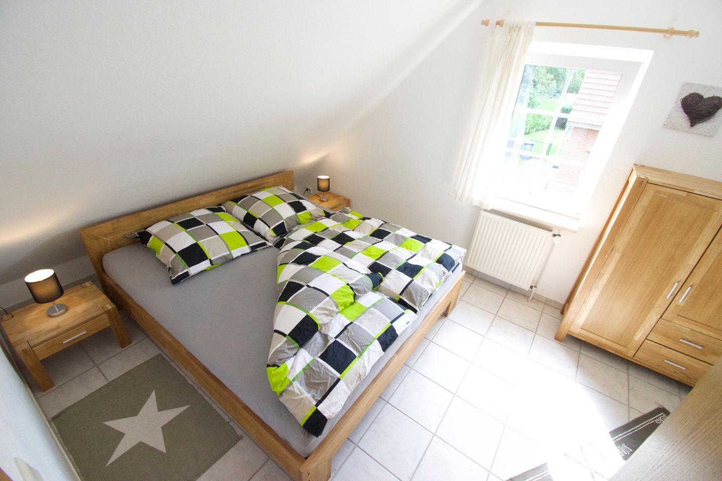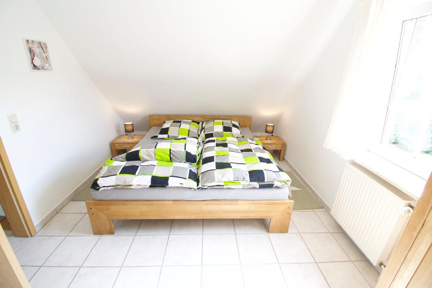 In einem der Schlafzimmer befindet sich ein 2 x 2 Meter großes Doppelbett und das Zimmer bietet ausreichend Platz, um ein Kinder-Reisebett aufzustellen.