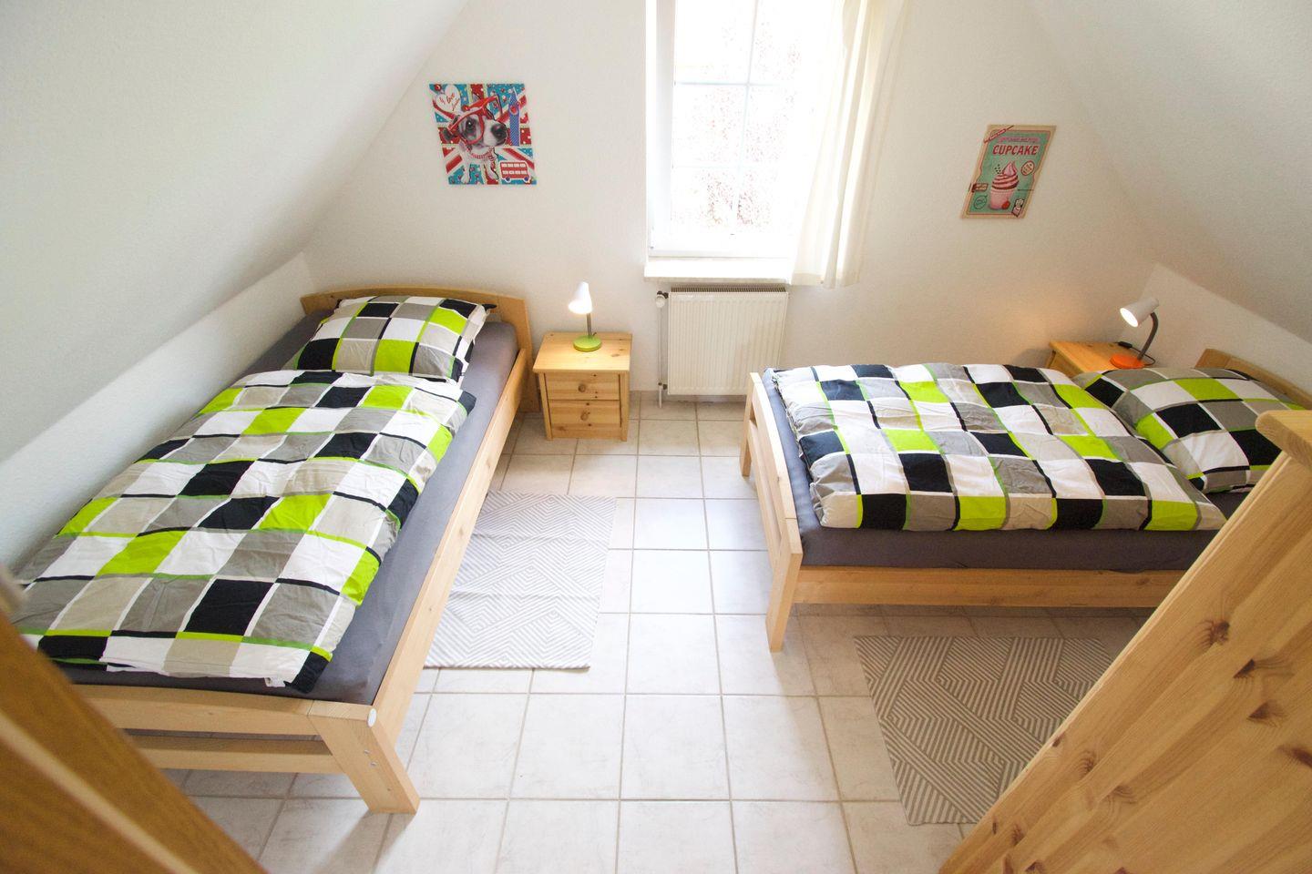 Das andere Schlafzimmer verfügt über 2 Einzelbetten mit den Maßen 1x 2 Meter.