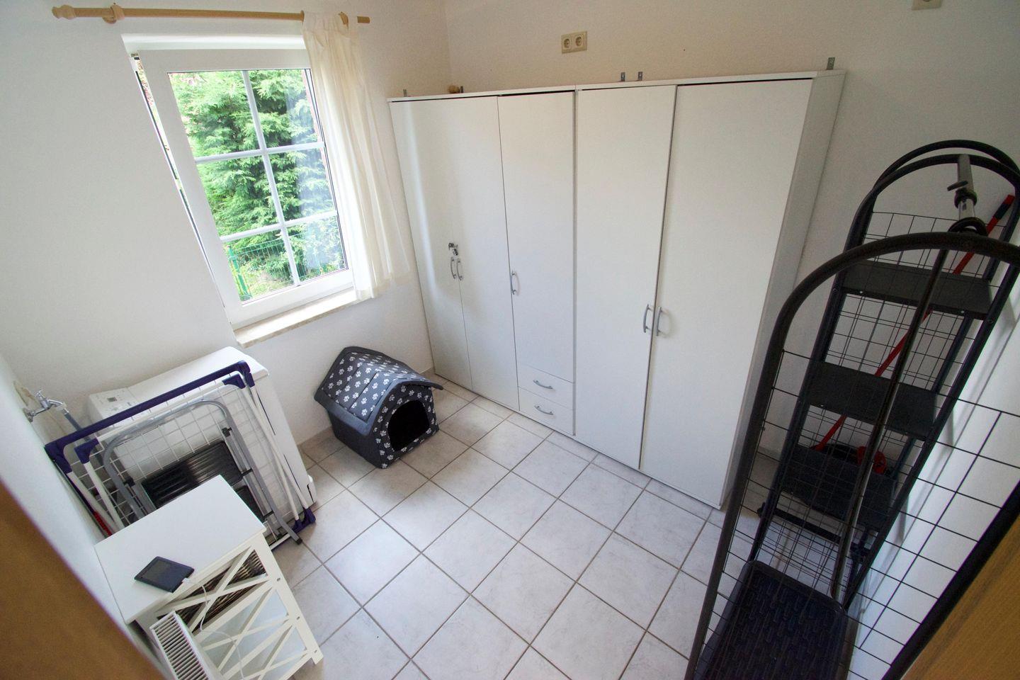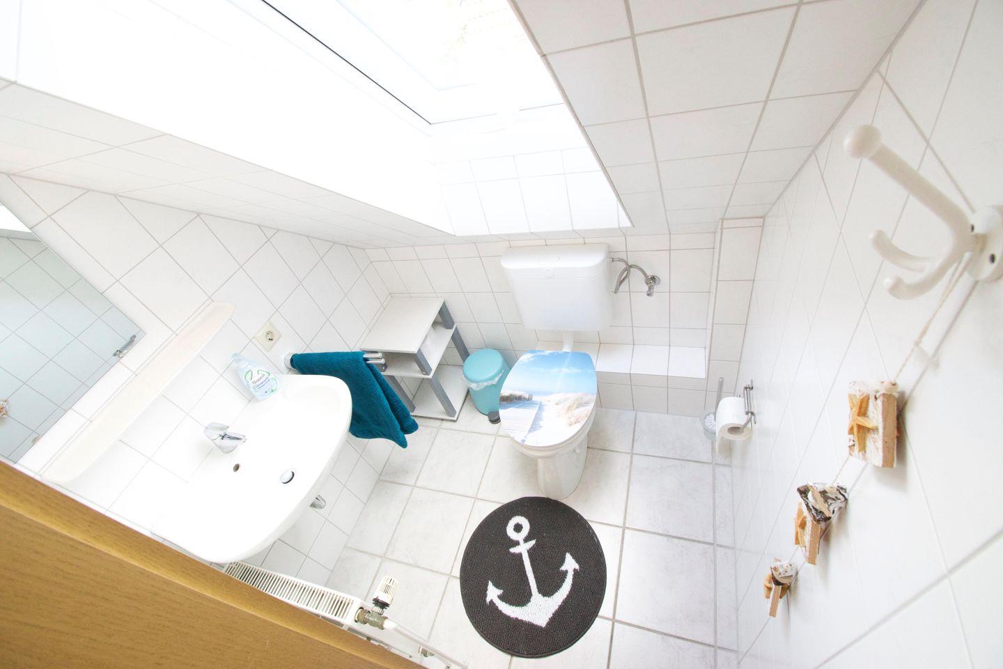 Ebenfalls im Erdgeschoss befindet sich das moderne Badezimmer mit WC, Waschtisch, einer bodenebenen Dusche, Fußbodenheizung und einem Handtuchheizkörper. Weiterhin befindet sich im Erdgeschoss ein Abstellraum mit Waschmaschine, Garderobe und Schränken.
