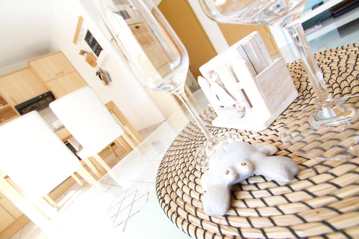 Die helle, freundliche Küchenzeile ist gut ausgestattet und verfügt u.a. über einen Backofen, ein Kochfeld mit 4 Kochplatten, einen Geschirrspüler, eine Kaffeemaschine, eine Microwelle, einen Toaster, einen Wasserkocher und einen Kühlschrank inklusive Gefrierfach.